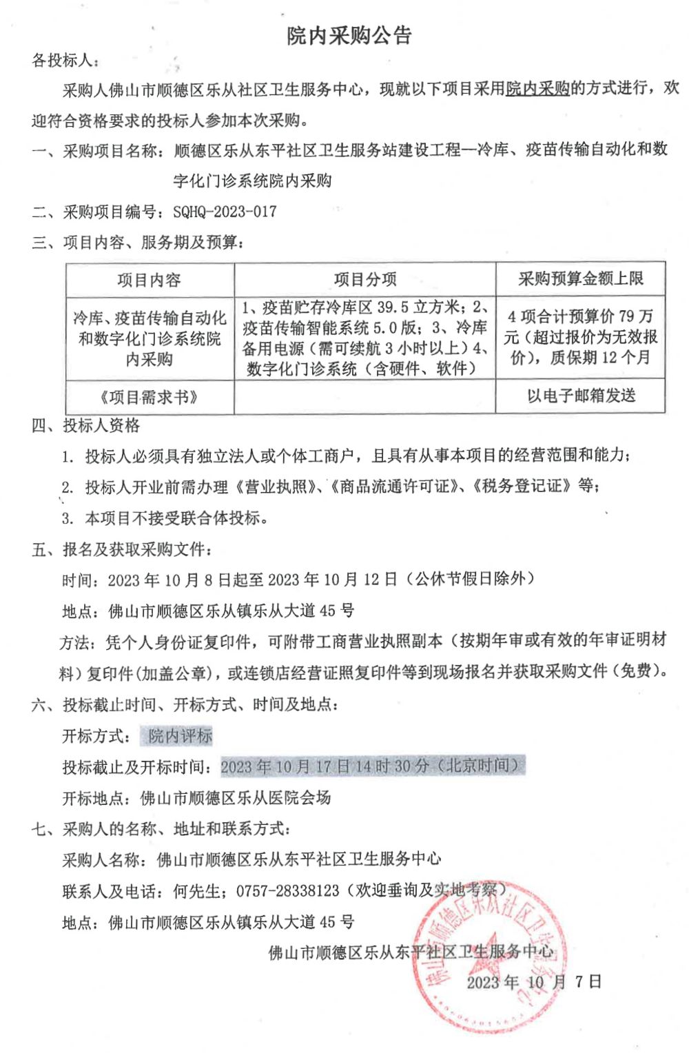 關(guān)于順德區(qū)樂(lè)從東平社區(qū)衛(wèi)生服務(wù)站建設(shè)工程-冷庫(kù)、疫苗傳輸自動(dòng)化和數(shù)字化門診系統(tǒng)的院內(nèi)采購(gòu)公告