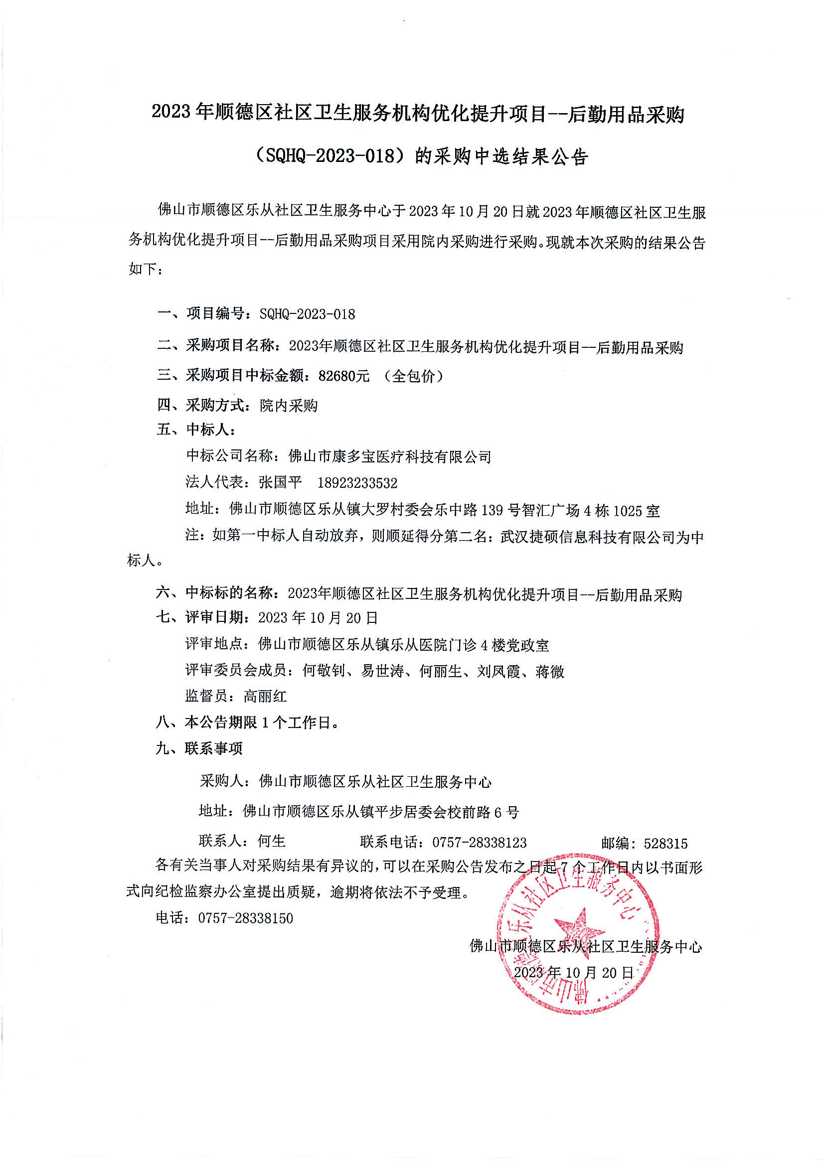 關(guān)于順德區(qū)社區(qū)衛(wèi)生服務(wù)機(jī)構(gòu)優(yōu)化提升項(xiàng)目——后勤用品采購(gòu)(SQHQ-2023-018)的院內(nèi)采購(gòu)結(jié)果公告