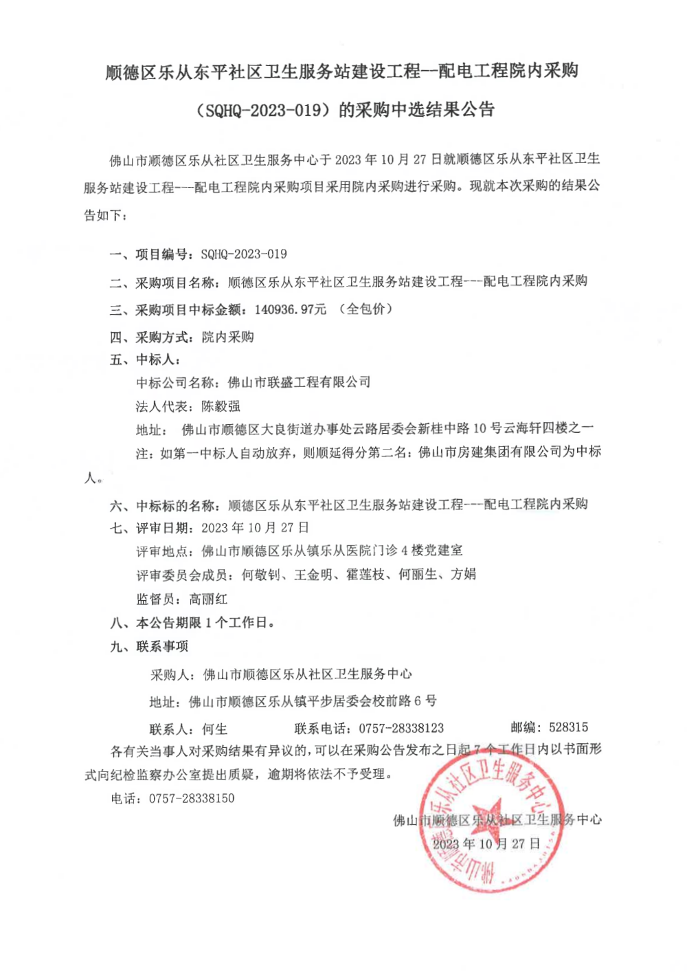 關(guān)于樂從東平社區(qū)衛(wèi)生服務(wù)站建設(shè)工程-配電工程(SQHQ-2023-019)的院內(nèi)采購(gòu)結(jié)果公告