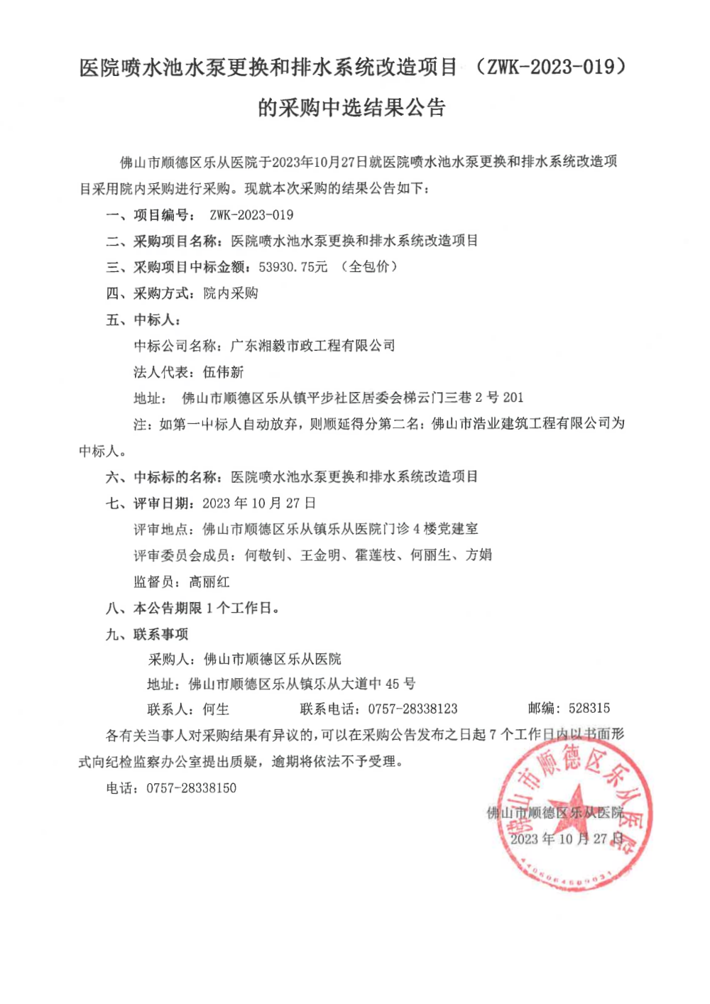 關(guān)于樂(lè)從醫(yī)院噴水池泵更換和排水系統(tǒng)改造項(xiàng)目(ZWK-2023-019)的院內(nèi)采購(gòu)結(jié)果公告