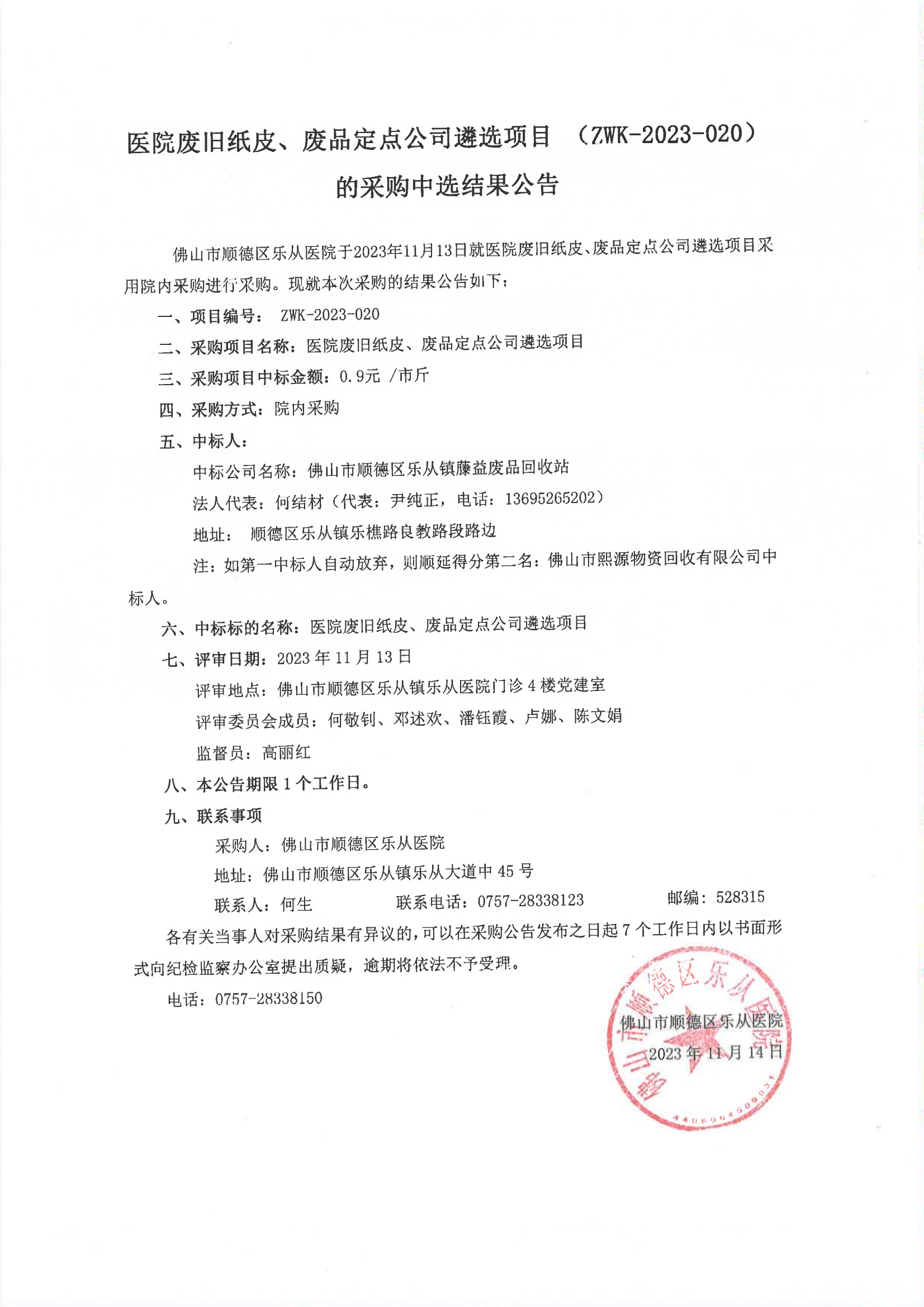 樂從醫(yī)院廢舊紙皮、廢品定點(diǎn)公司遴選項(xiàng)目(ZWK-2023-020)的院內(nèi)采購結(jié)果公告