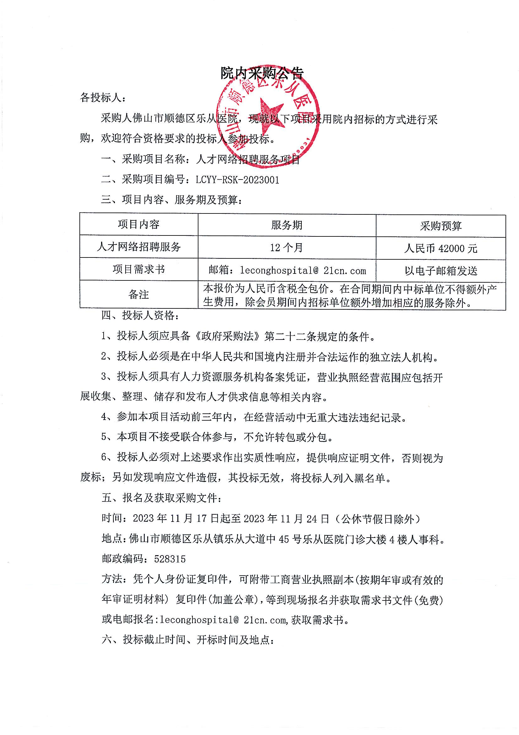樂從醫(yī)院人才網(wǎng)絡(luò)招聘服務(wù)項(xiàng)目的院內(nèi)采購公告