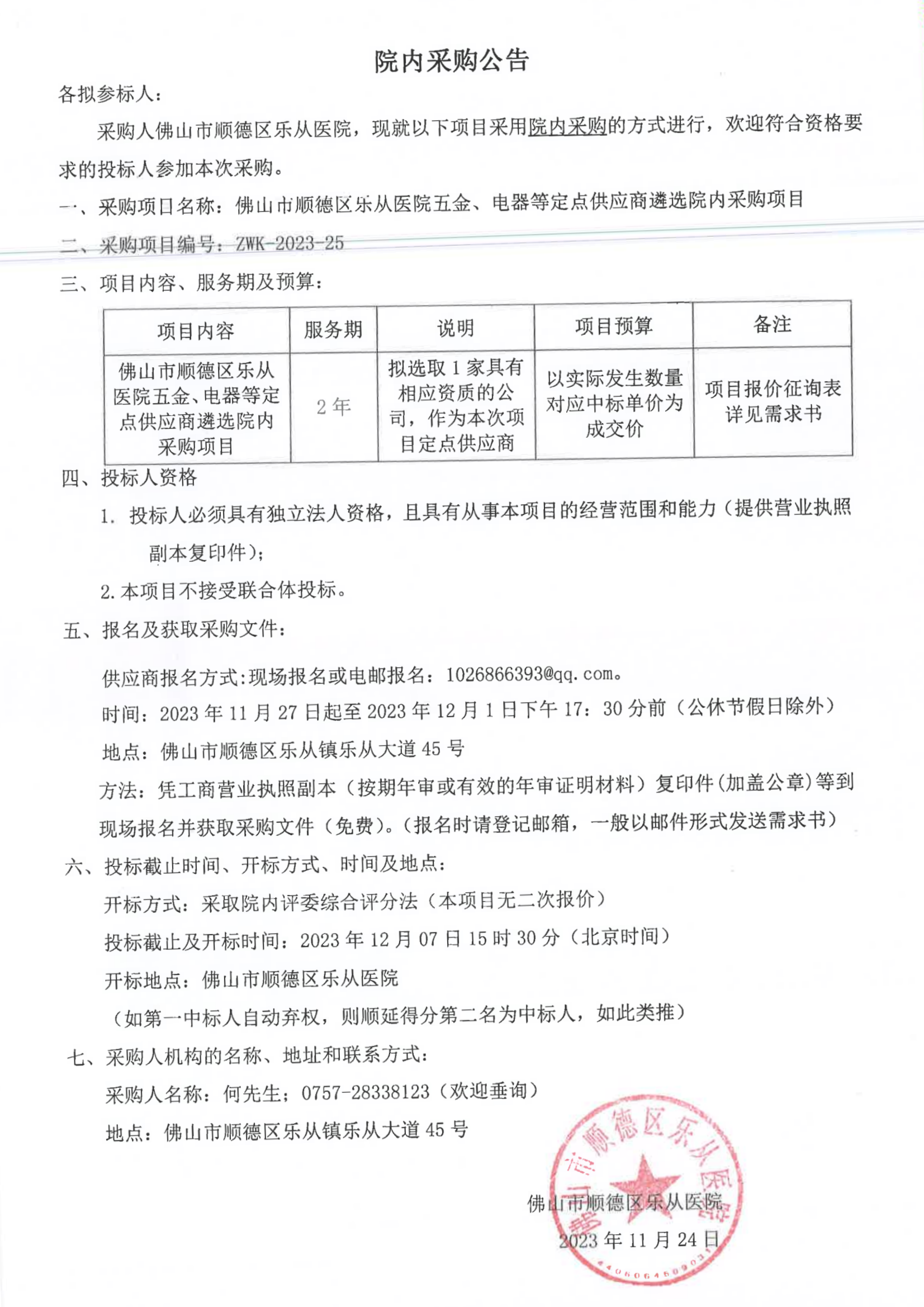 關于樂從醫(yī)院五金、電器等定點供應商遴選的院內采購公告