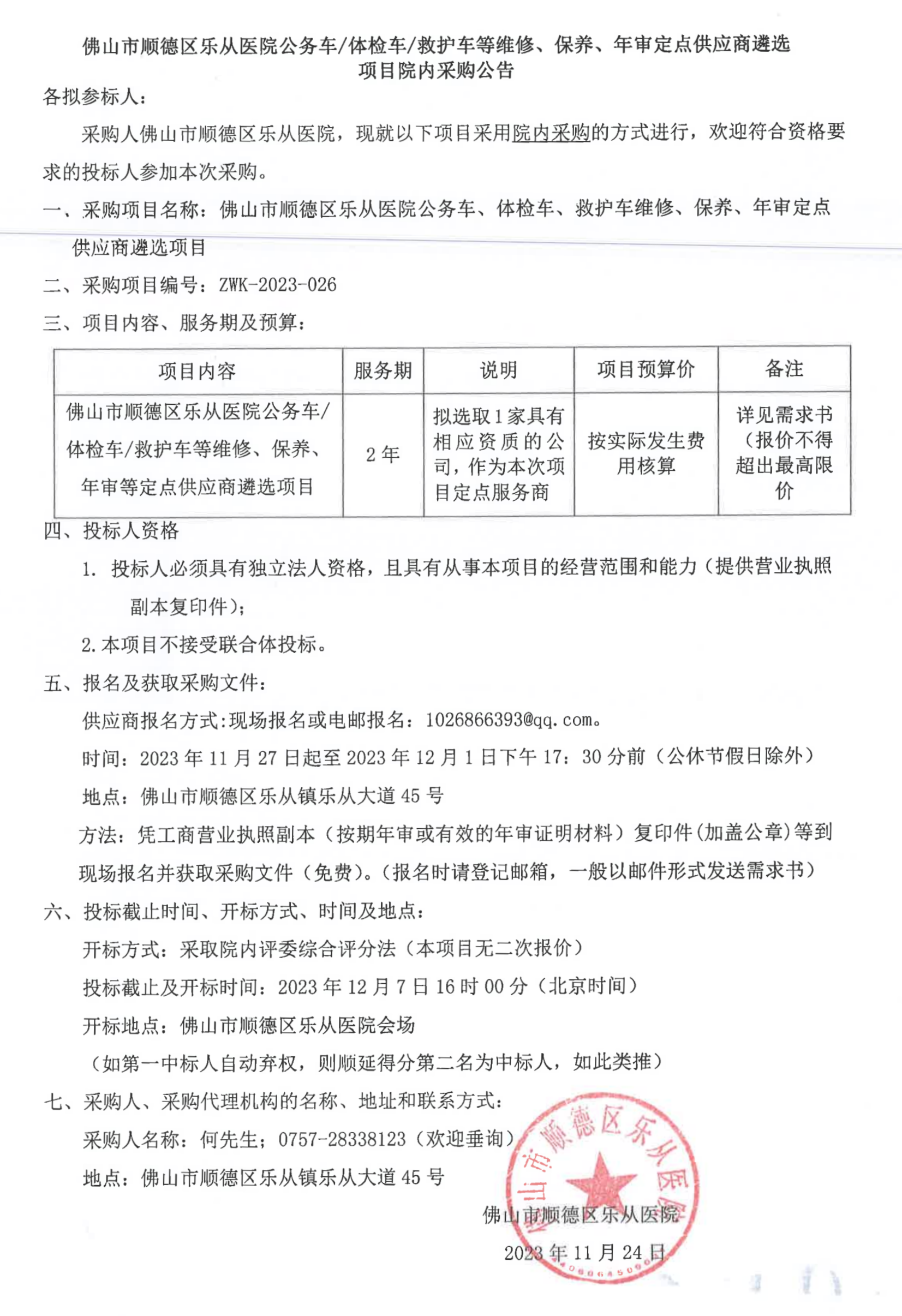 關(guān)于樂從醫(yī)院公務(wù)車/體檢車/救護(hù)車等維修、保養(yǎng)、年審定點供應(yīng)商遴選項目的院內(nèi)采購公告