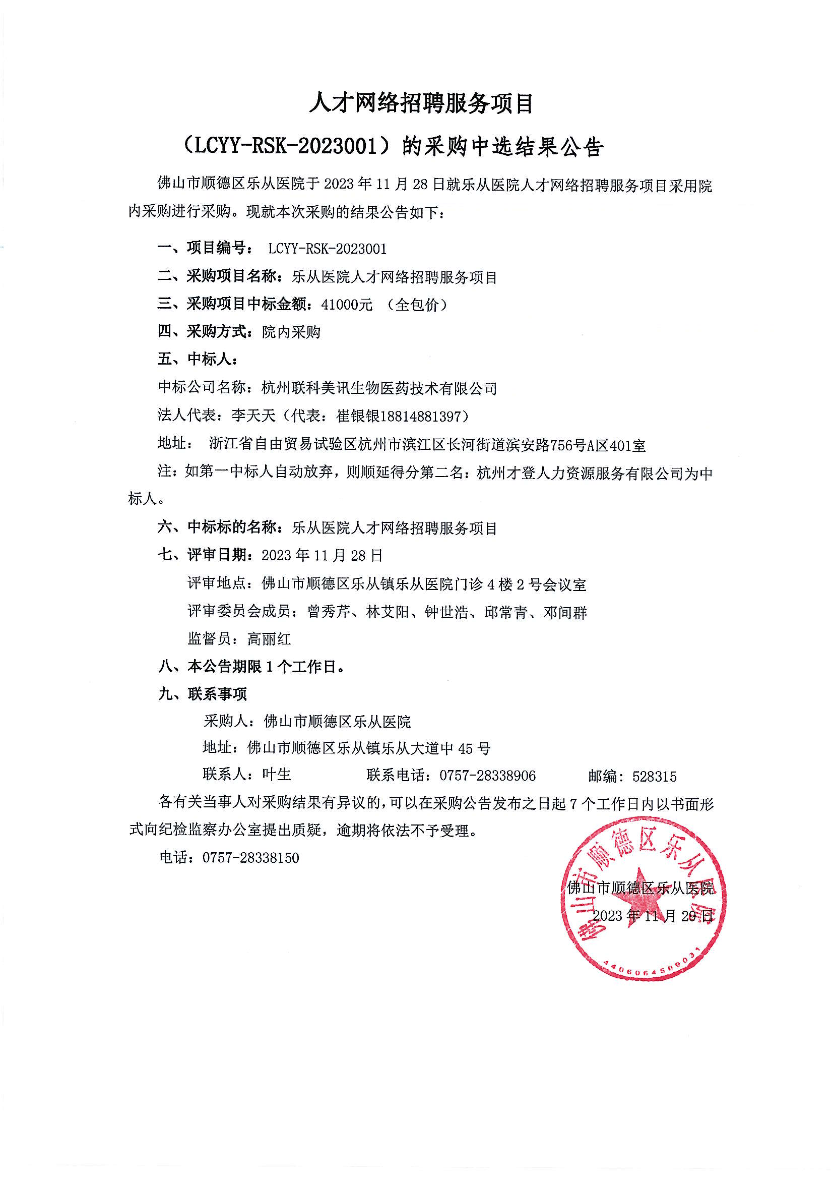 關(guān)于樂從醫(yī)院人才網(wǎng)絡(luò)招聘服務(wù)項(xiàng)目(LCYY-RSK-2023001)的院內(nèi)采購結(jié)果公告