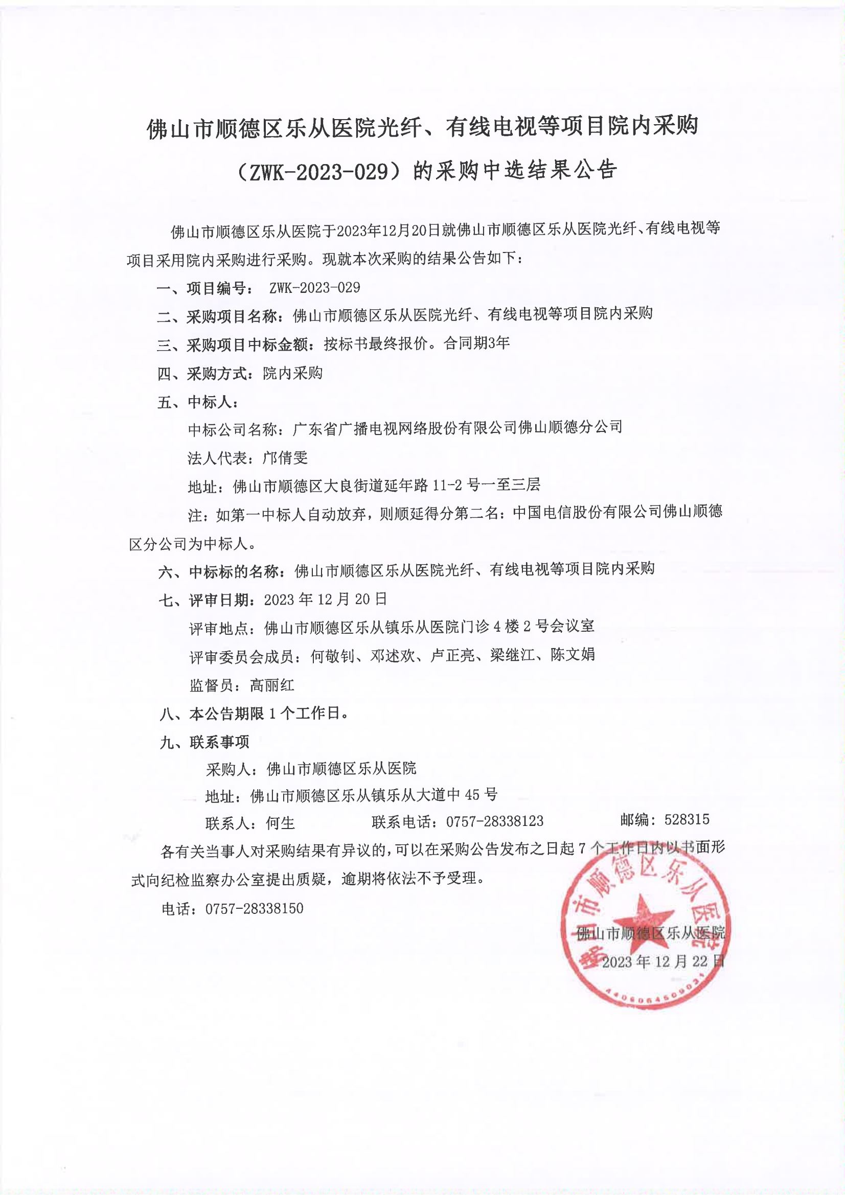 關(guān)于樂從醫(yī)院光纖、有線電視等項目(ZWK-2023-029)的院內(nèi)采購結(jié)果公告