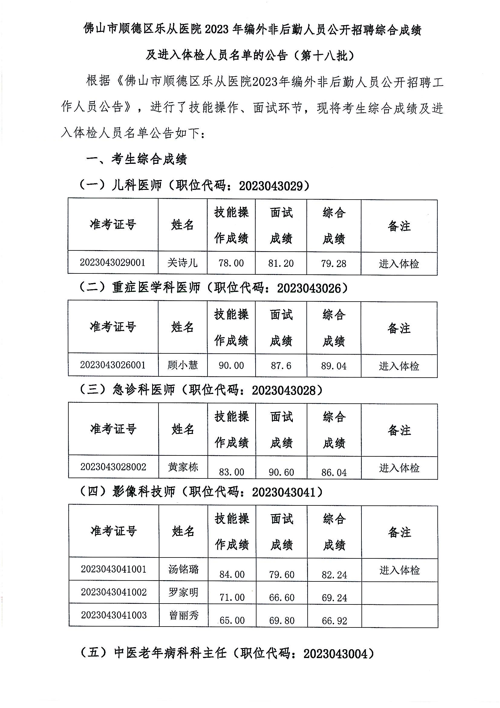 樂(lè)從醫(yī)院2023年編外非后勤人員公開(kāi)招聘綜合成績(jī)及進(jìn)入體檢人員名單的公告(第十八批)