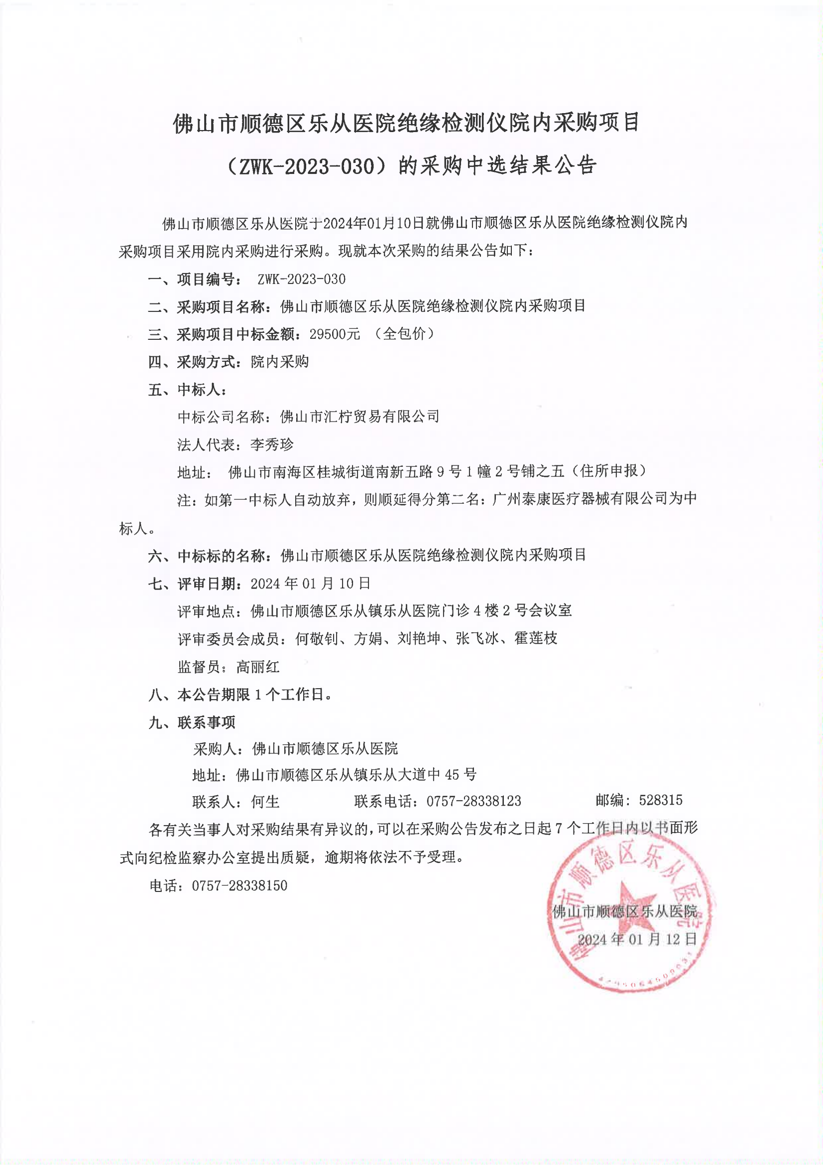 樂從醫(yī)院絕緣檢測(cè)儀項(xiàng)目(ZWK-2023-030)的院內(nèi)采購(gòu)結(jié)果公告