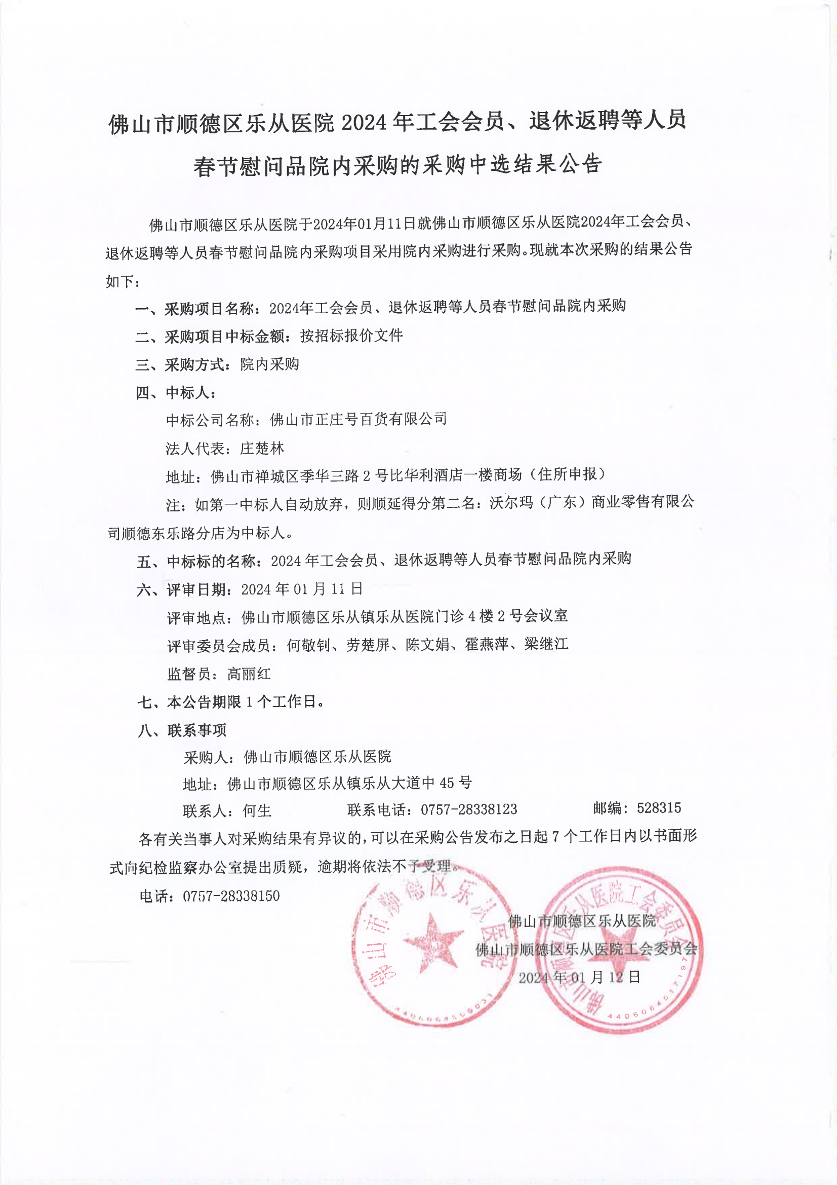 樂(lè)從醫(yī)院2024年工會(huì)會(huì)員、退休返聘等人員春節(jié)慰問(wèn)項(xiàng)目的院內(nèi)采購(gòu)結(jié)果公告