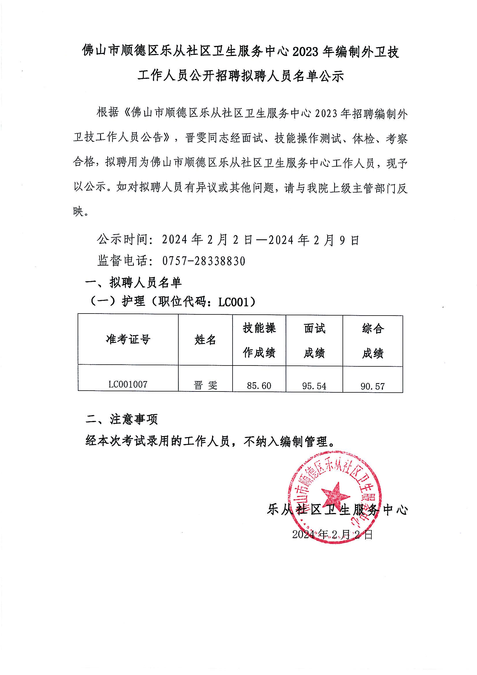 關(guān)于樂從社區(qū)衛(wèi)生服務(wù)中心2023年編制外衛(wèi)技工作人員公開招聘擬聘人員名單公示