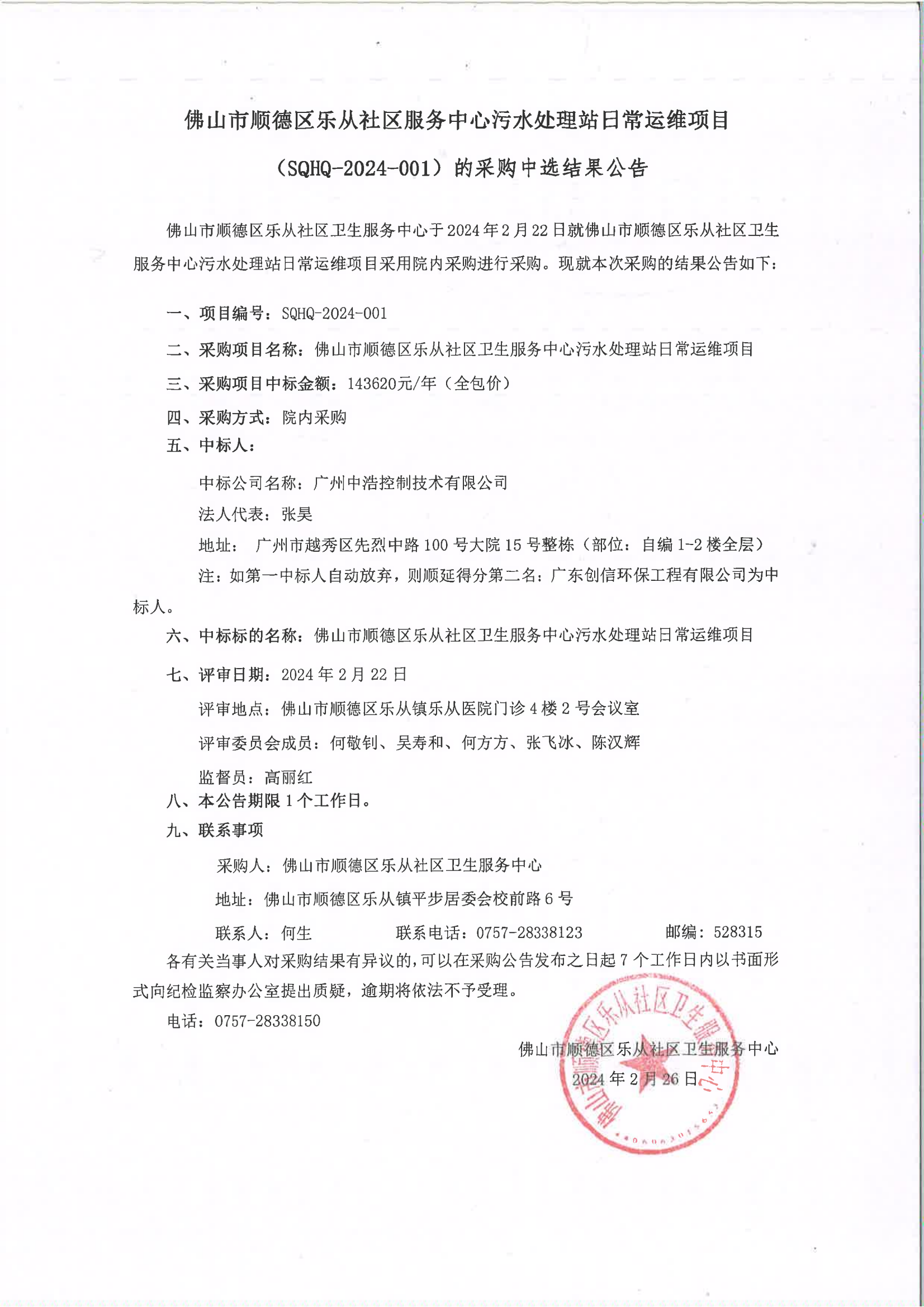 樂從社區(qū)衛(wèi)生服務(wù)中心污水處理站日常運(yùn)維項(xiàng)目(SQHQ-2024-001)的院內(nèi)采購(gòu)結(jié)果公告
