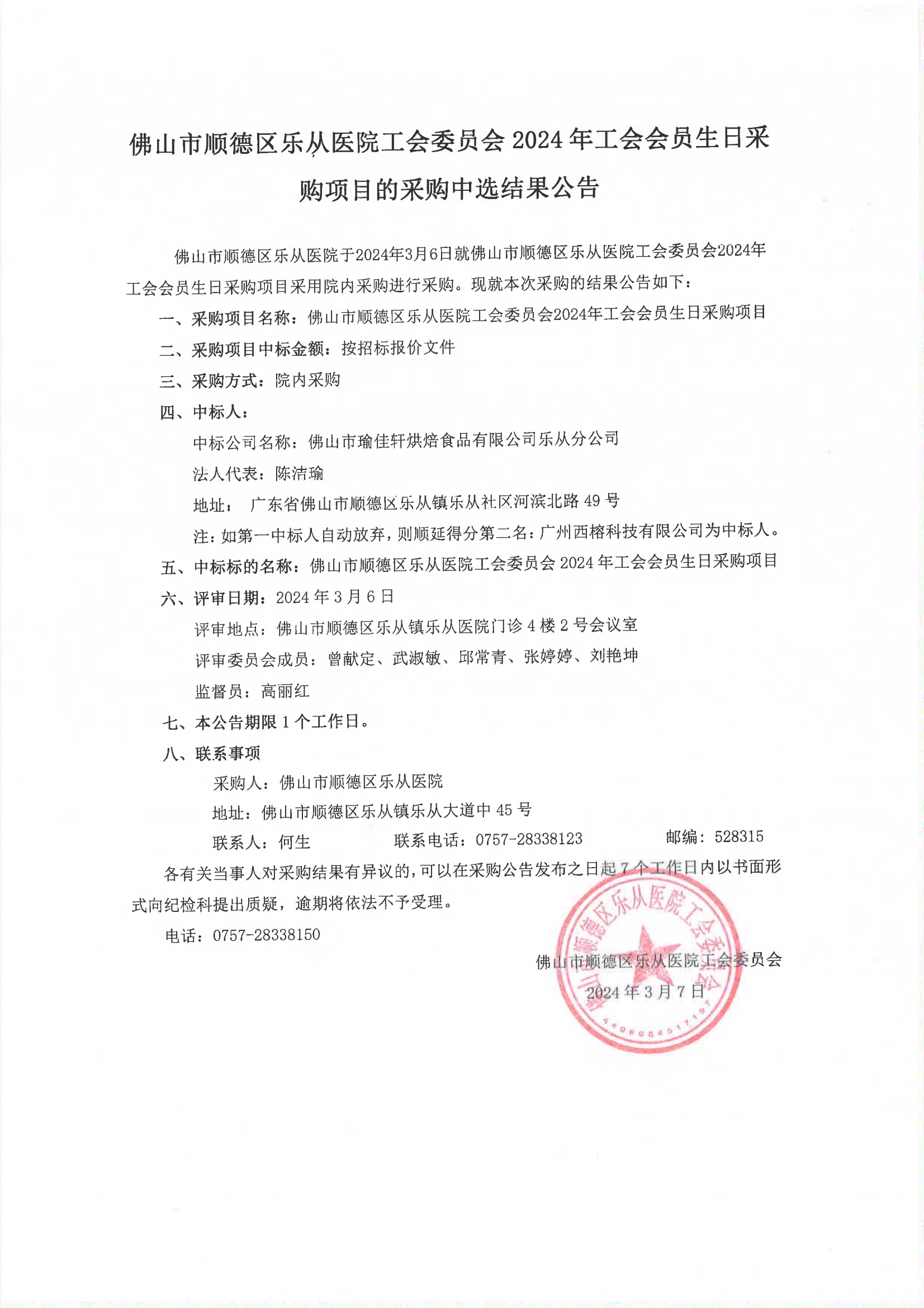 樂從醫(yī)院工會(huì)委員會(huì)2024年工會(huì)會(huì)員生日采購項(xiàng)目的院內(nèi)采購結(jié)果公告