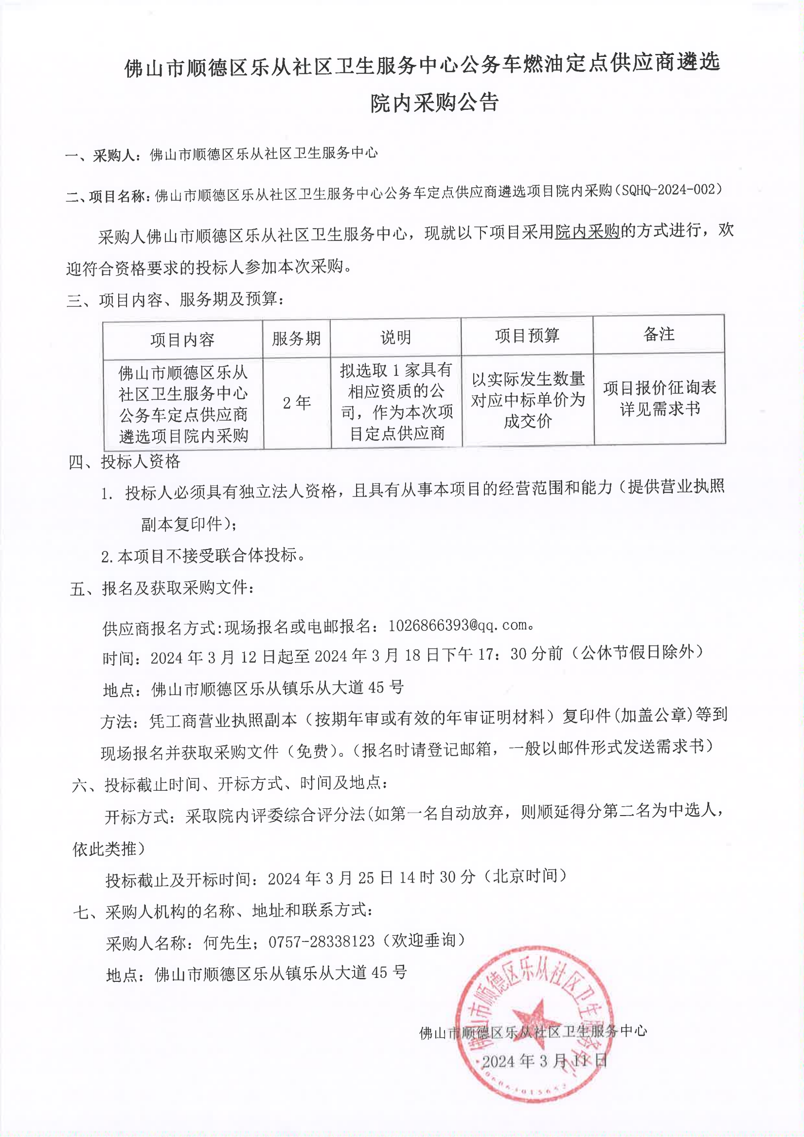樂(lè)從社區(qū)衛(wèi)生服務(wù)中心公務(wù)車(chē)燃油定點(diǎn)供應(yīng)商遴選項(xiàng)目的院內(nèi)采購(gòu)公告