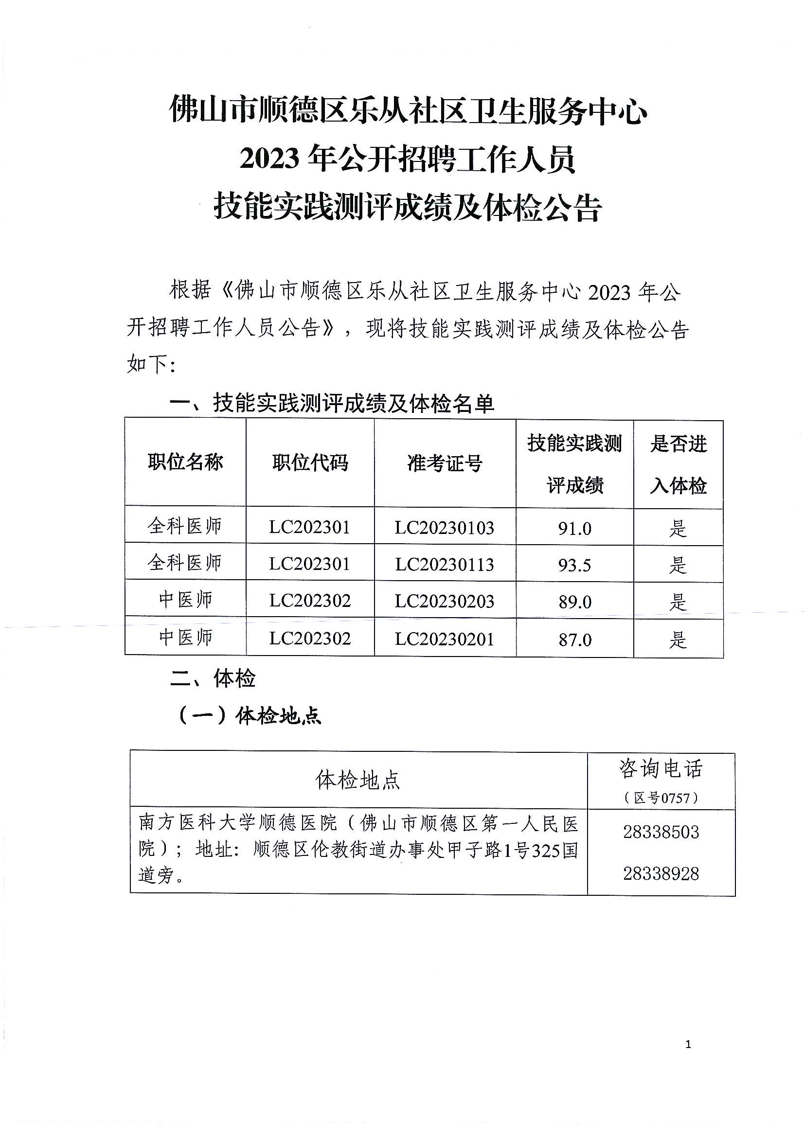 樂從社區(qū)衛(wèi)生服務(wù)中心2023年公開招聘工作人員技能實踐測評成績及體檢公告