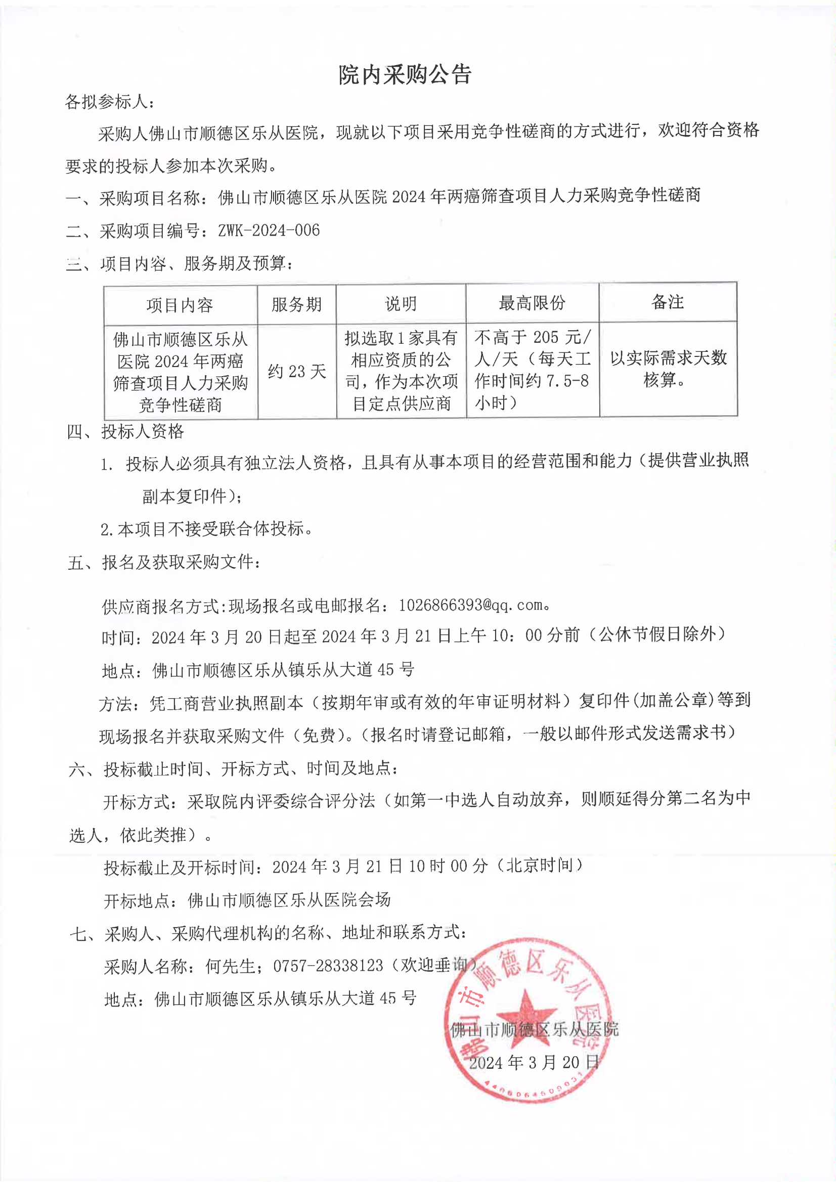 樂從醫(yī)院2024年樂從健共體兩癌篩查項(xiàng)目人力采購競(jìng)爭(zhēng)性磋商公告