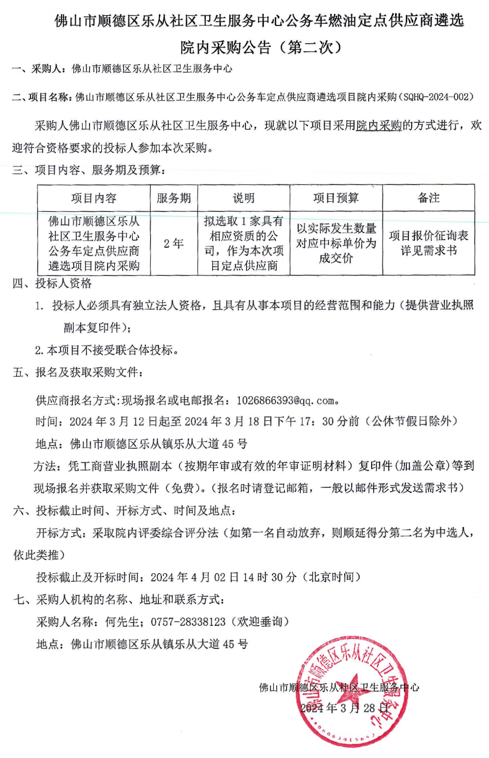 樂從社區(qū)衛(wèi)生服務(wù)中心公務(wù)車燃油定點供應(yīng)商遴選的院內(nèi)采購公告(第二次)