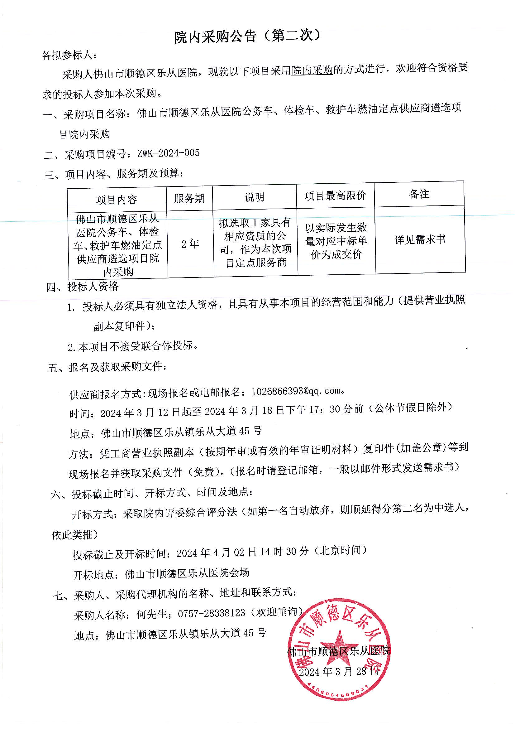樂從醫(yī)院公務(wù)車、體檢車、救護(hù)車燃油定點(diǎn)供應(yīng)商遴選項(xiàng)目的院內(nèi)采購(gòu)公告(第二次)