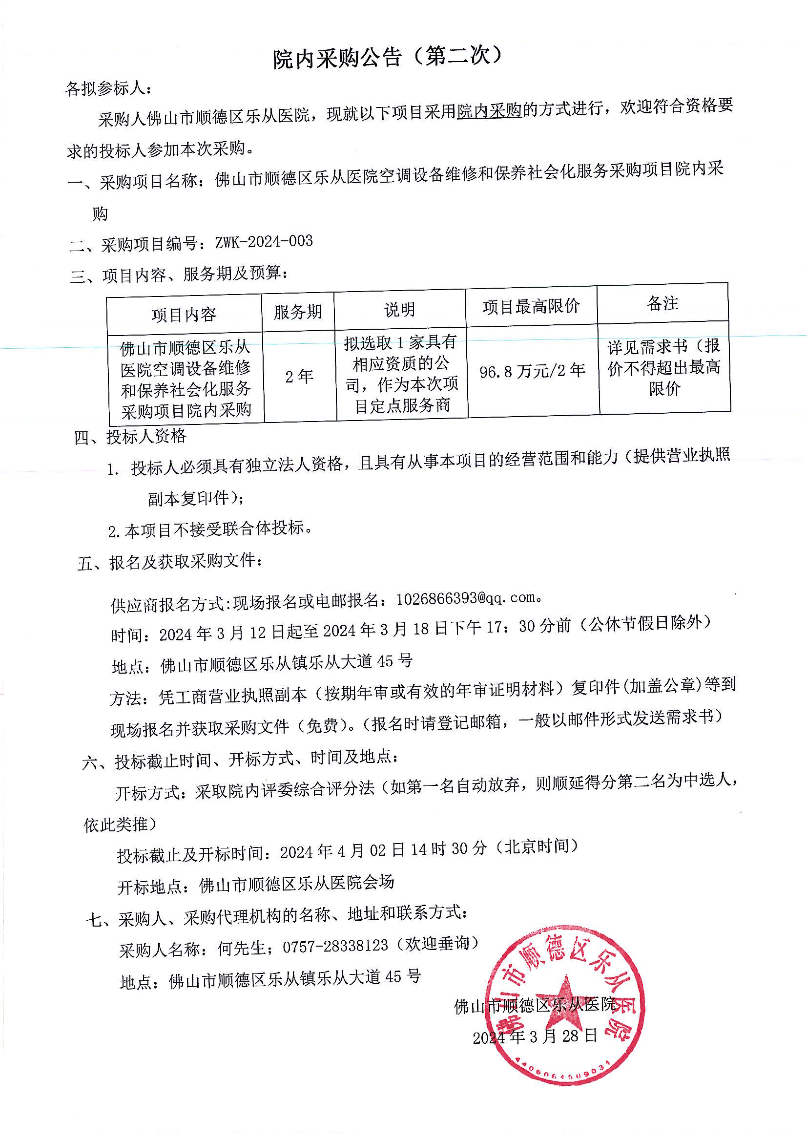 樂(lè)從醫(yī)院空調(diào)設(shè)備維修和保養(yǎng)社會(huì)化服務(wù)采購(gòu)項(xiàng)目的院內(nèi)采購(gòu)公告(第二次)