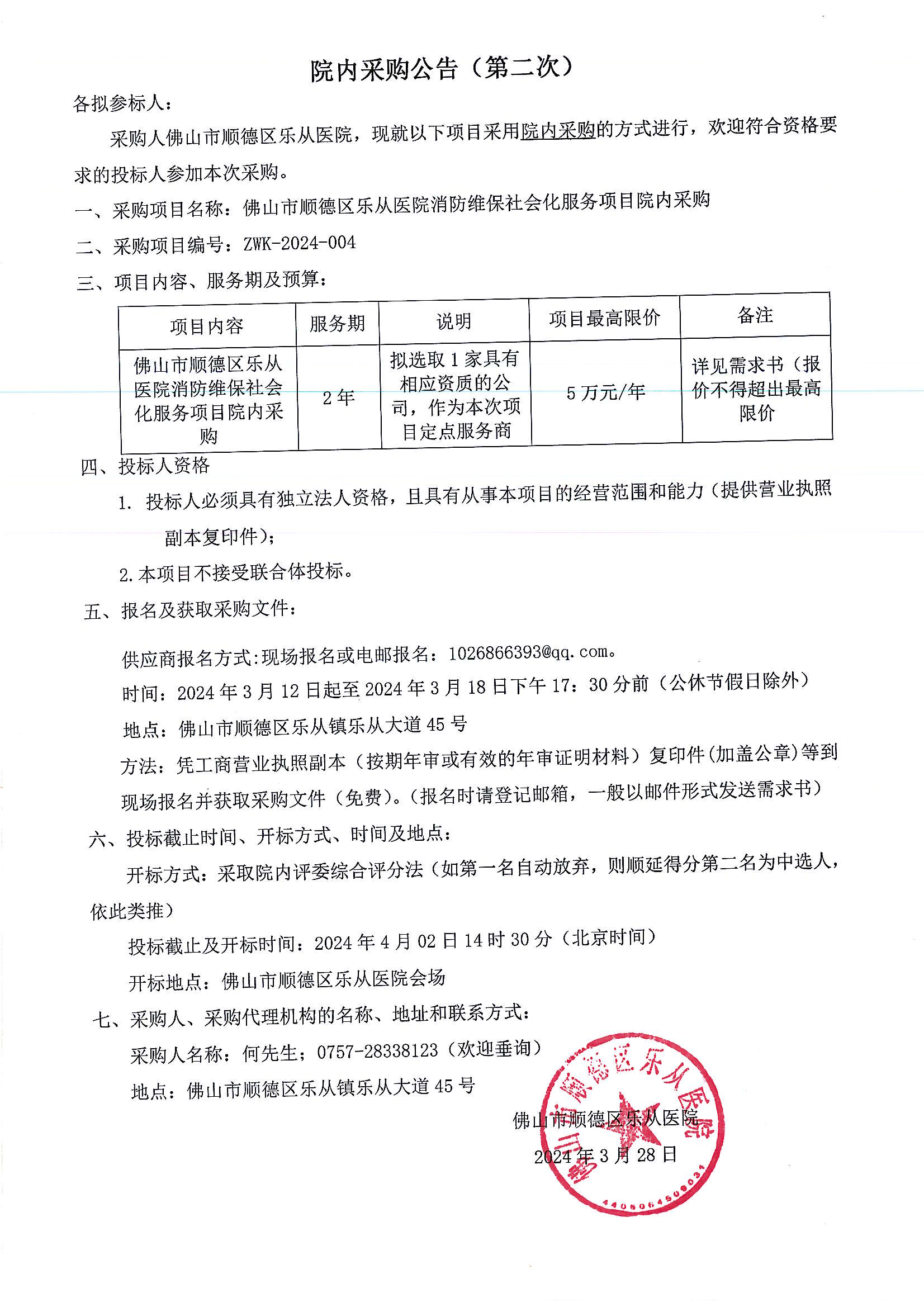 樂從醫(yī)院消防維保社會(huì)化服務(wù)項(xiàng)目的院內(nèi)采購(gòu)公告(第二次)