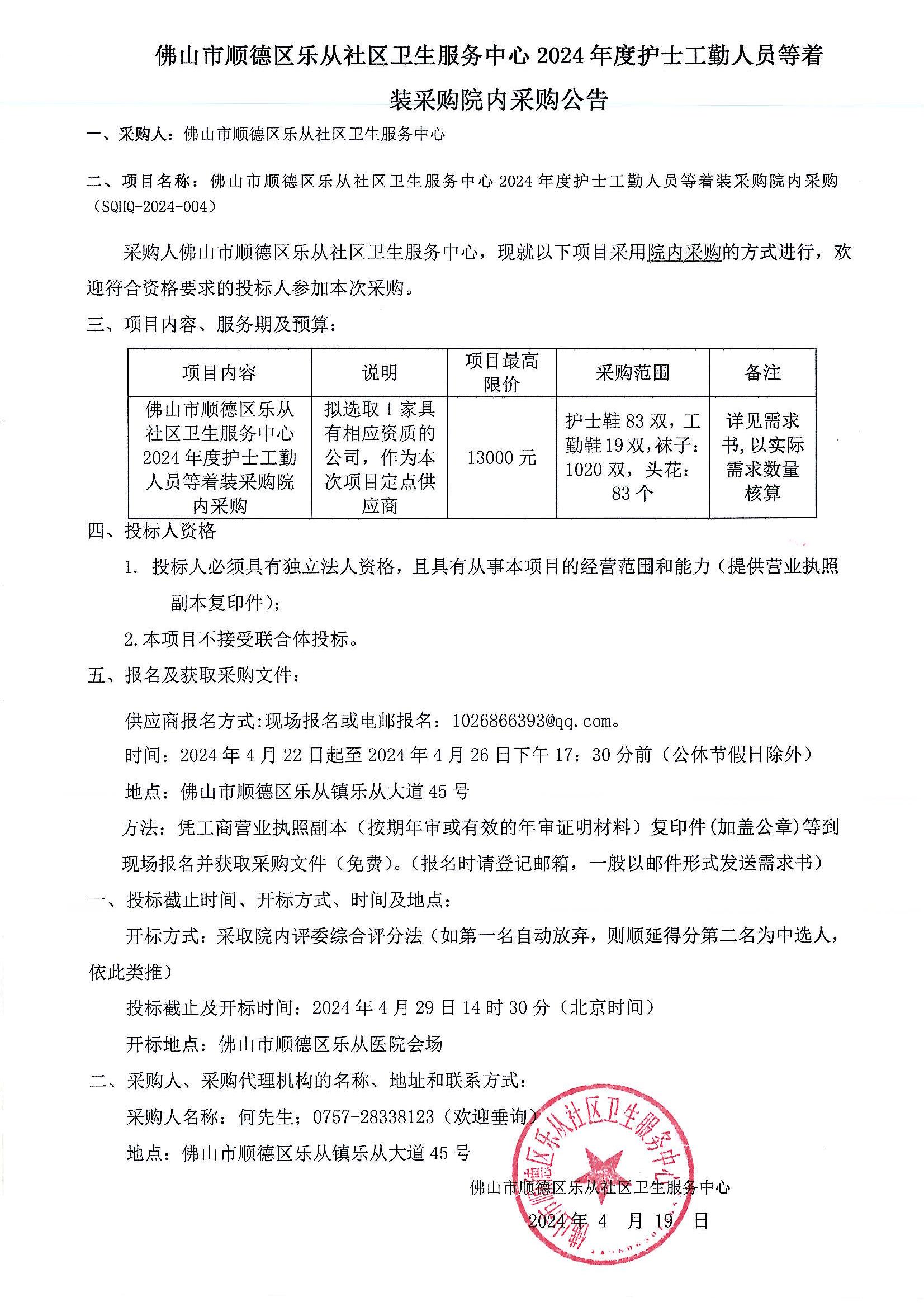 樂從社區(qū)衛(wèi)生服務(wù)中心2024年度護士工勤人員等著裝項目的院內(nèi)采購公告