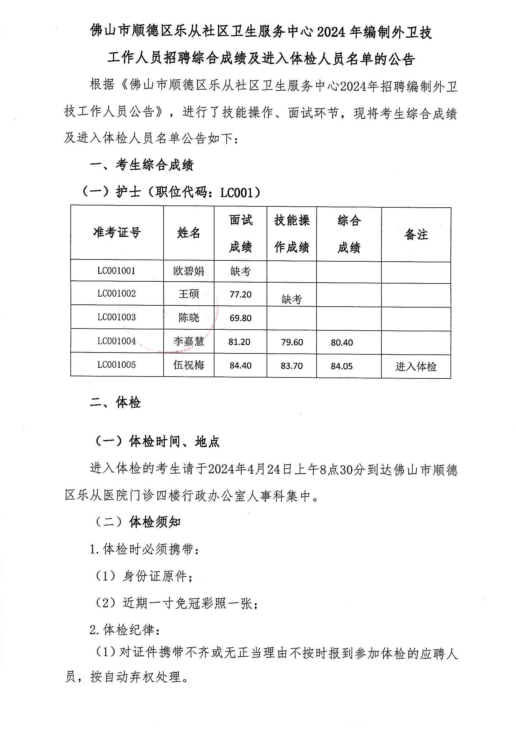 樂從社區(qū)衛(wèi)生服務(wù)中心2024年編制外衛(wèi)技工作人員招聘綜合成績(jī)及進(jìn)入體檢人員名單的公告