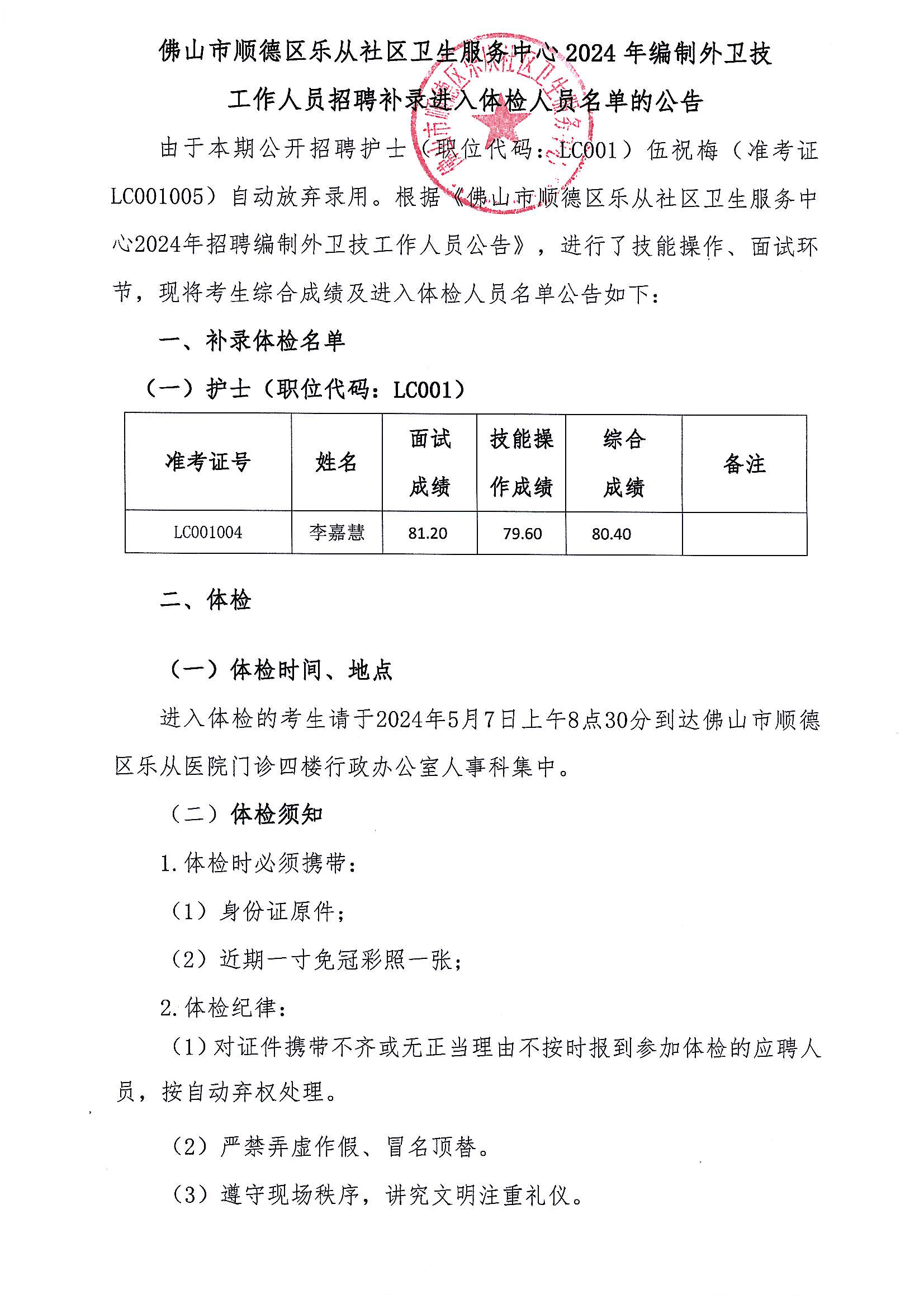 樂從社區(qū)衛(wèi)生服務(wù)中心2024年編制外衛(wèi)技工作人員招聘補(bǔ)錄進(jìn)入體檢人員名單的公告