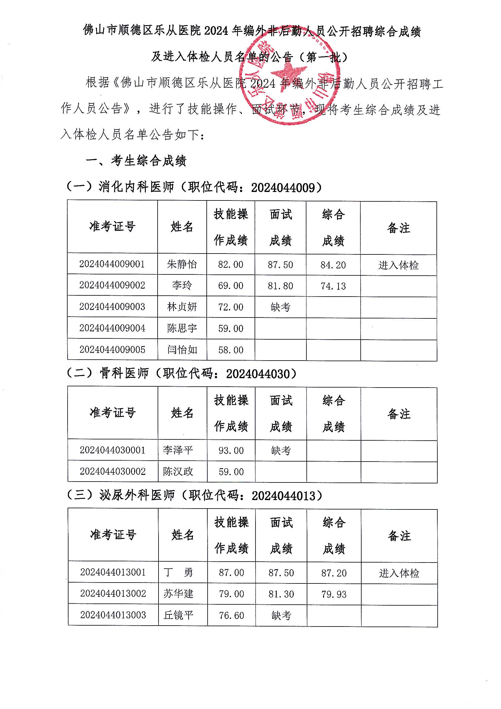 樂從醫(yī)院2024年編外非后勤人員公開招聘綜合成績及進(jìn)入體檢人員名單的公告(第一批)