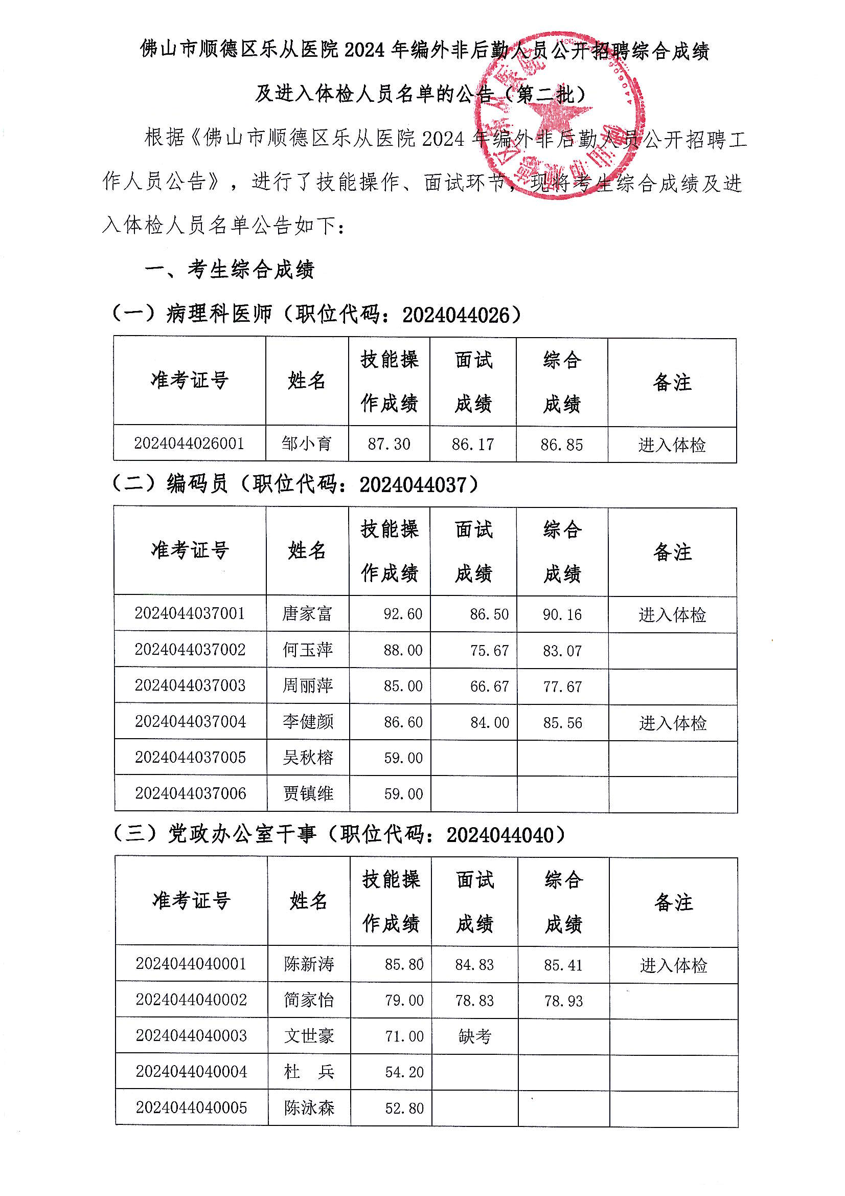 樂從醫(yī)院2024年編外非后勤人員公開招聘綜合成績及進(jìn)入體檢人員名單的公告(第二批)