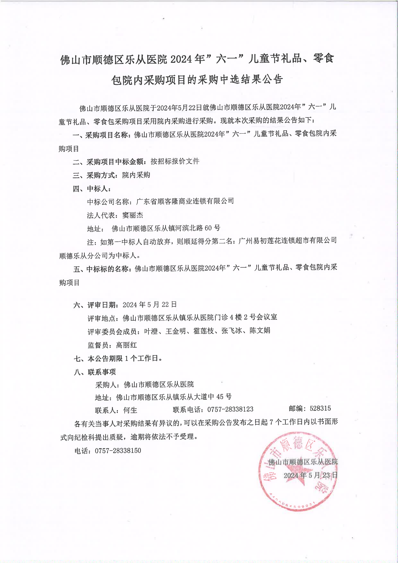 樂從醫(yī)院2024年“六一”兒童節(jié)禮品、零食包項目的院內采購結果公告