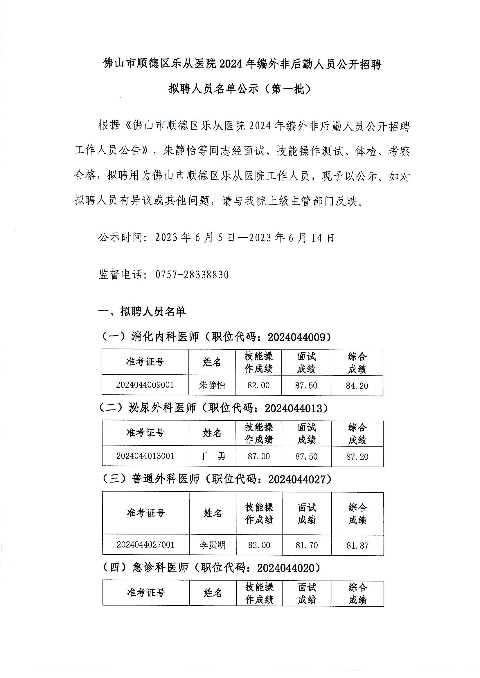 樂從醫(yī)院2024年編外非后勤人員公開招聘擬聘人員名單公示(第一批)