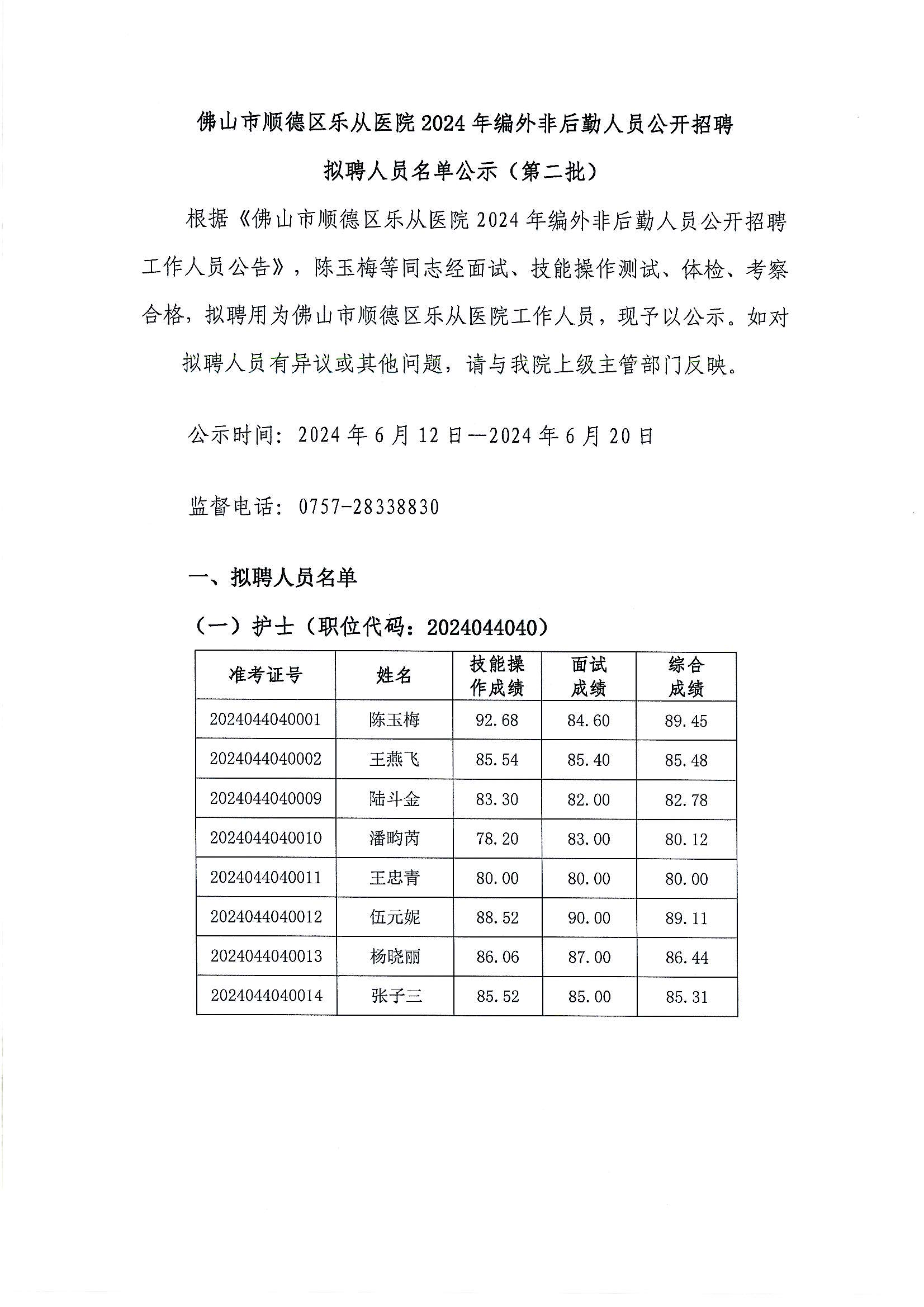 樂從醫(yī)院2024年編外非后勤人員公開招聘擬聘人員名單公示(第二批)