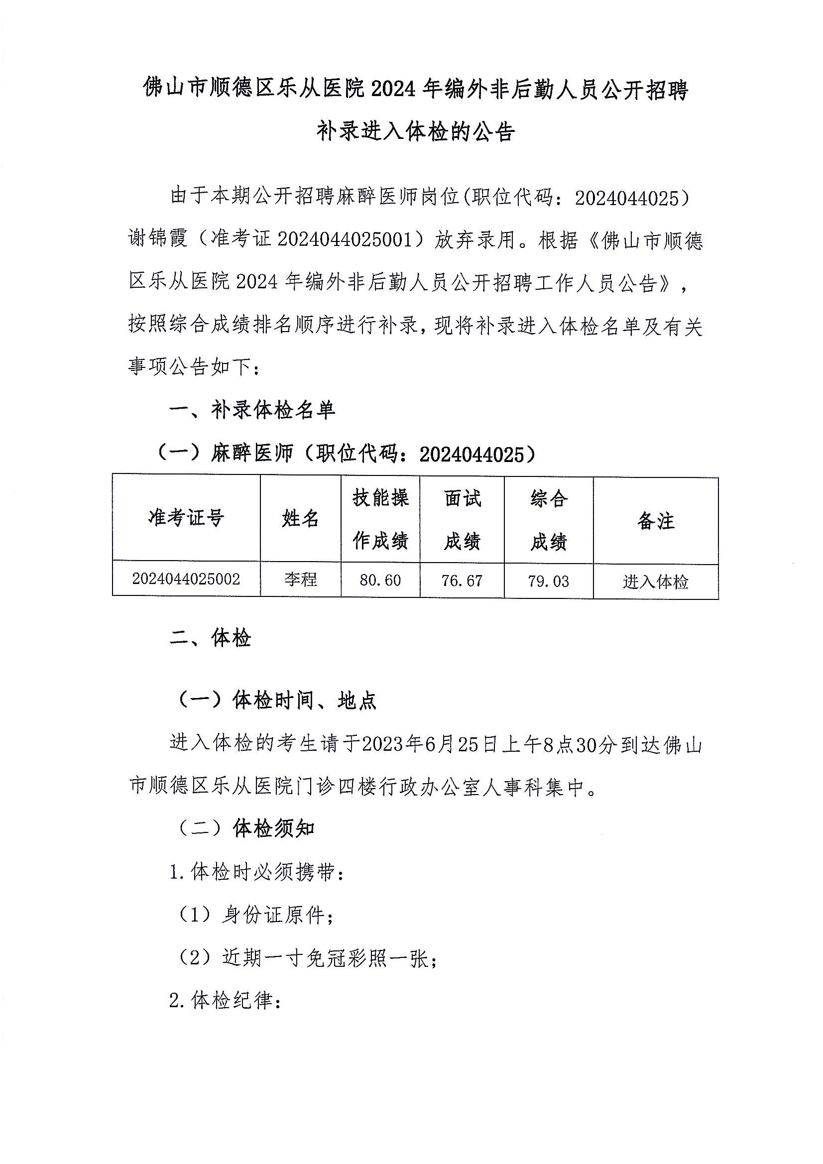 樂從醫(yī)院2024年編外非后勤人員公開招聘補錄進入體檢的公告