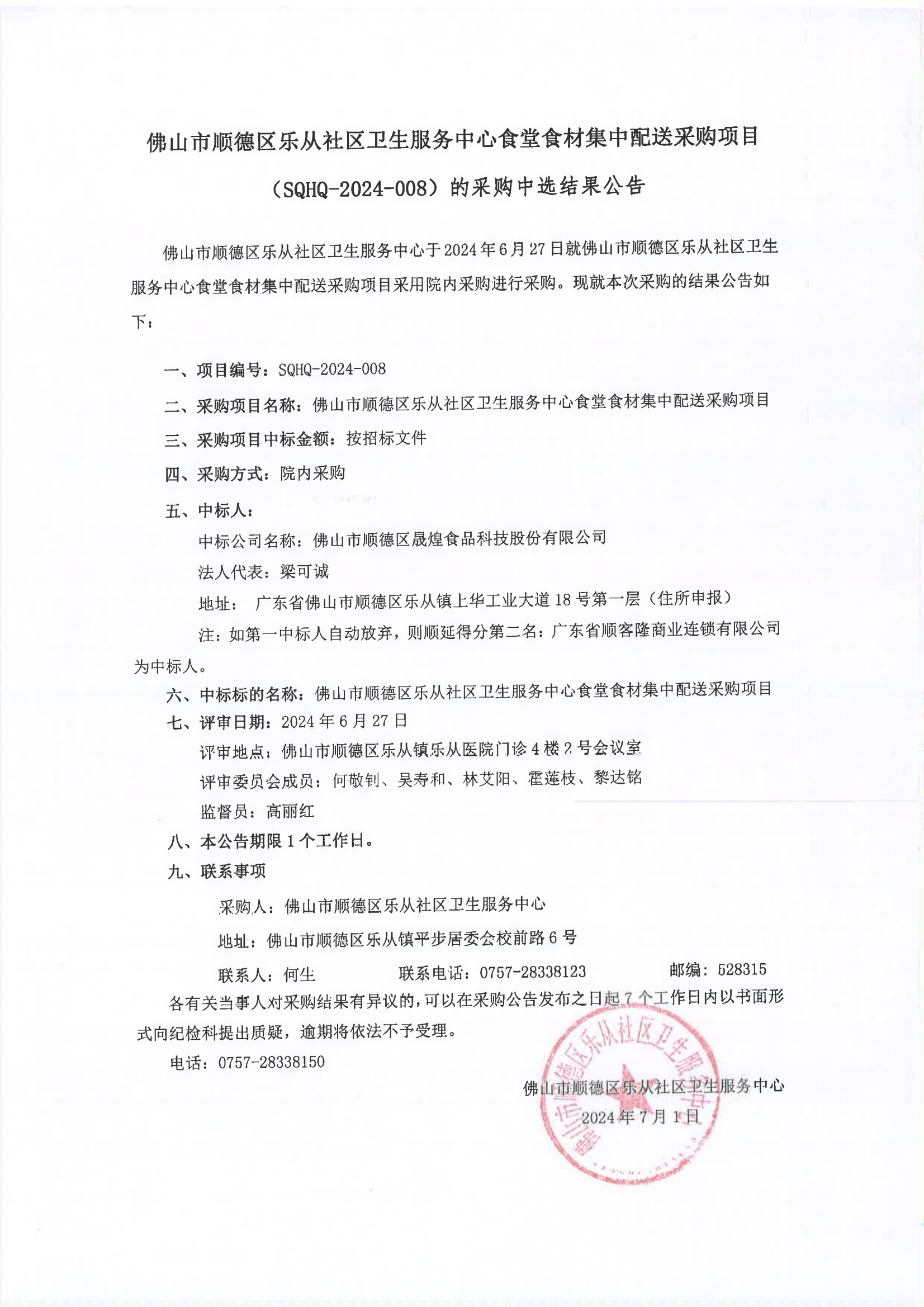 樂從社區(qū)衛(wèi)生服務(wù)中心食堂食材集中配送采購項目(SQHQ-2024-008)的采購中選結(jié)果公告