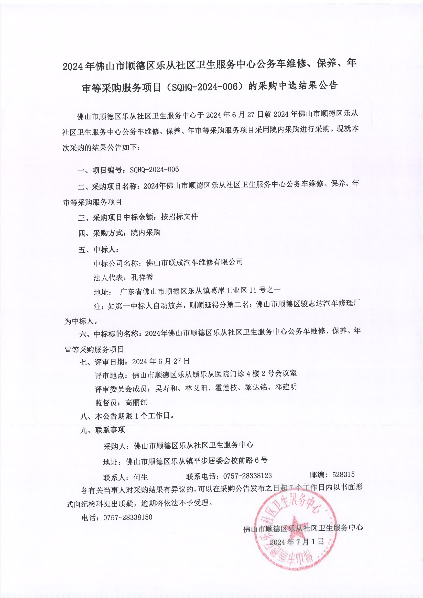 樂從社區(qū)衛(wèi)生服務中心公務車維修、保養(yǎng)、年審等采購服務項目(SQHQ-2024-06)的采購中選結果公告