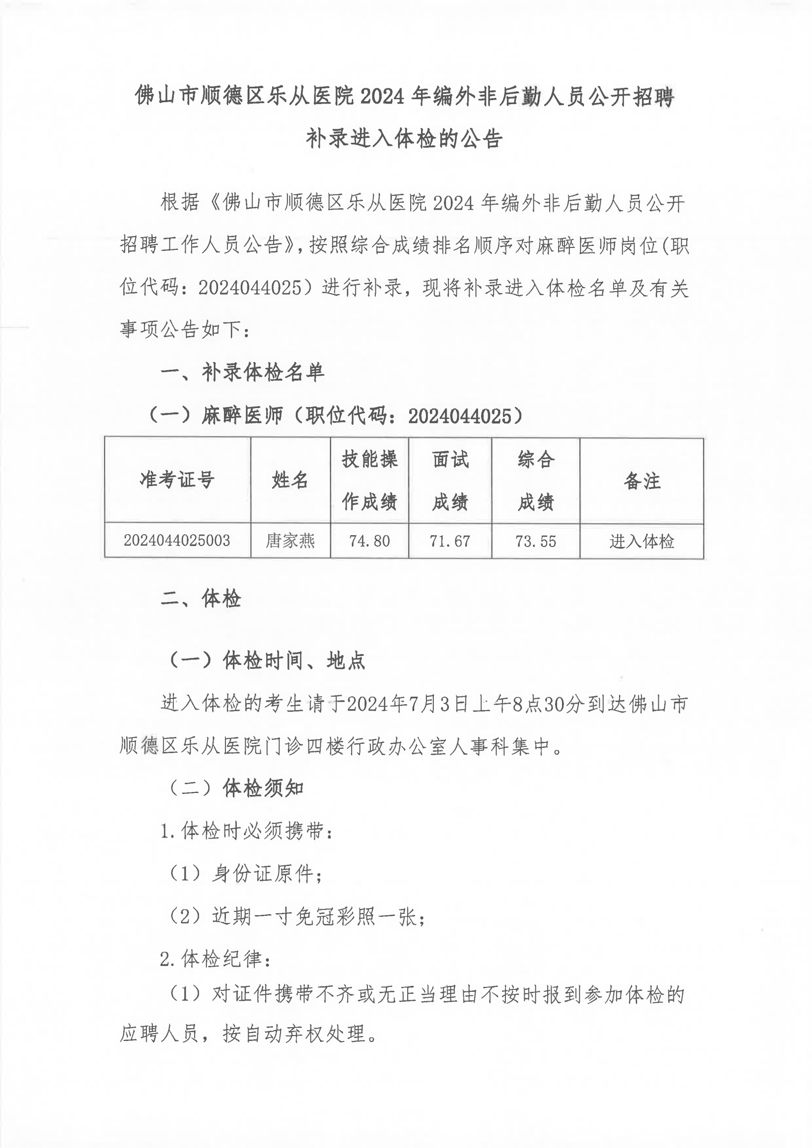 樂從醫(yī)院2024年編外非后勤人員公開招聘補(bǔ)錄進(jìn)入體檢的公告