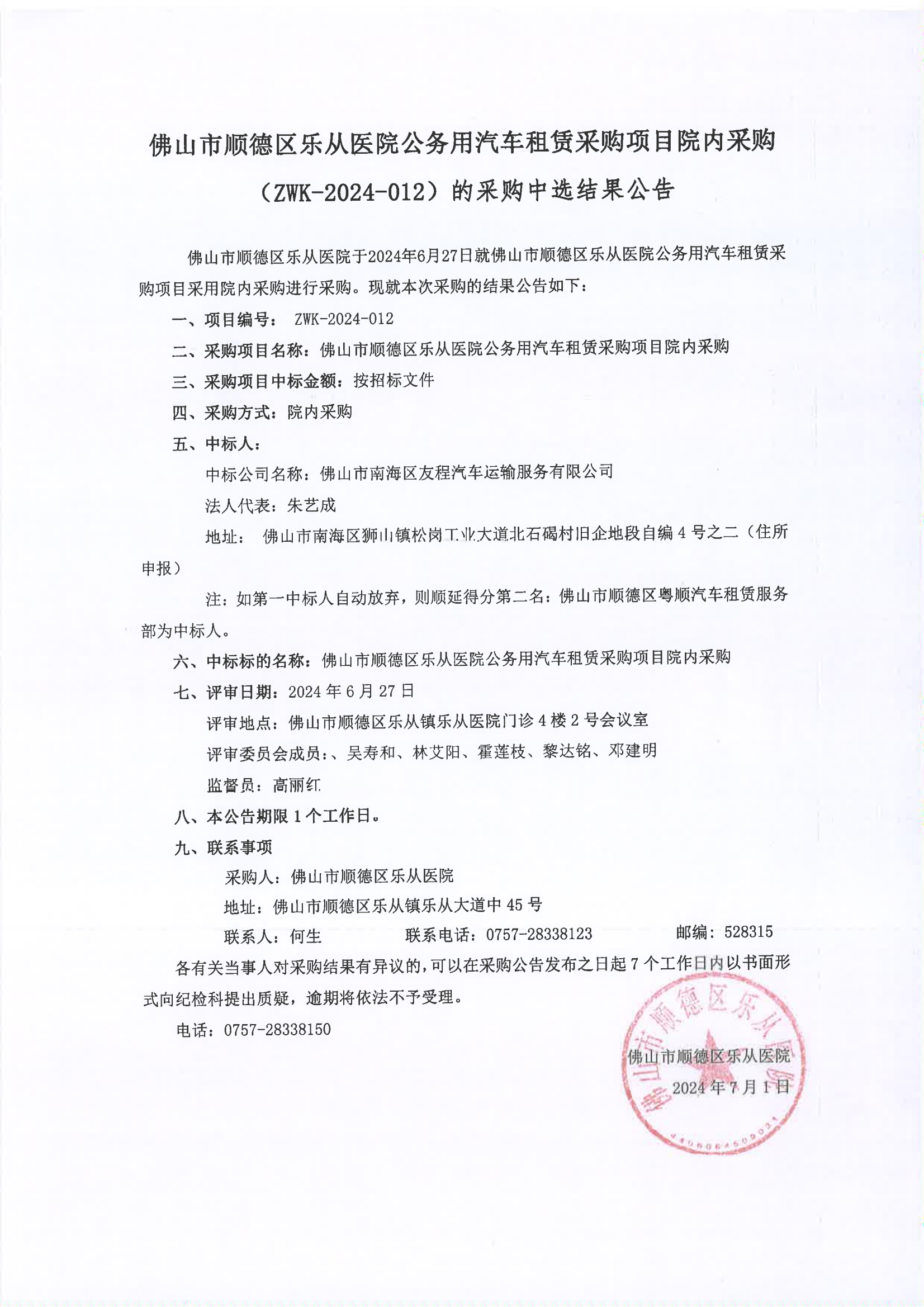 樂(lè)從醫(yī)院公務(wù)用汽車租賃采購(gòu)項(xiàng)目院內(nèi)采購(gòu)(ZWK-2024-012)的采購(gòu)中選結(jié)果公告