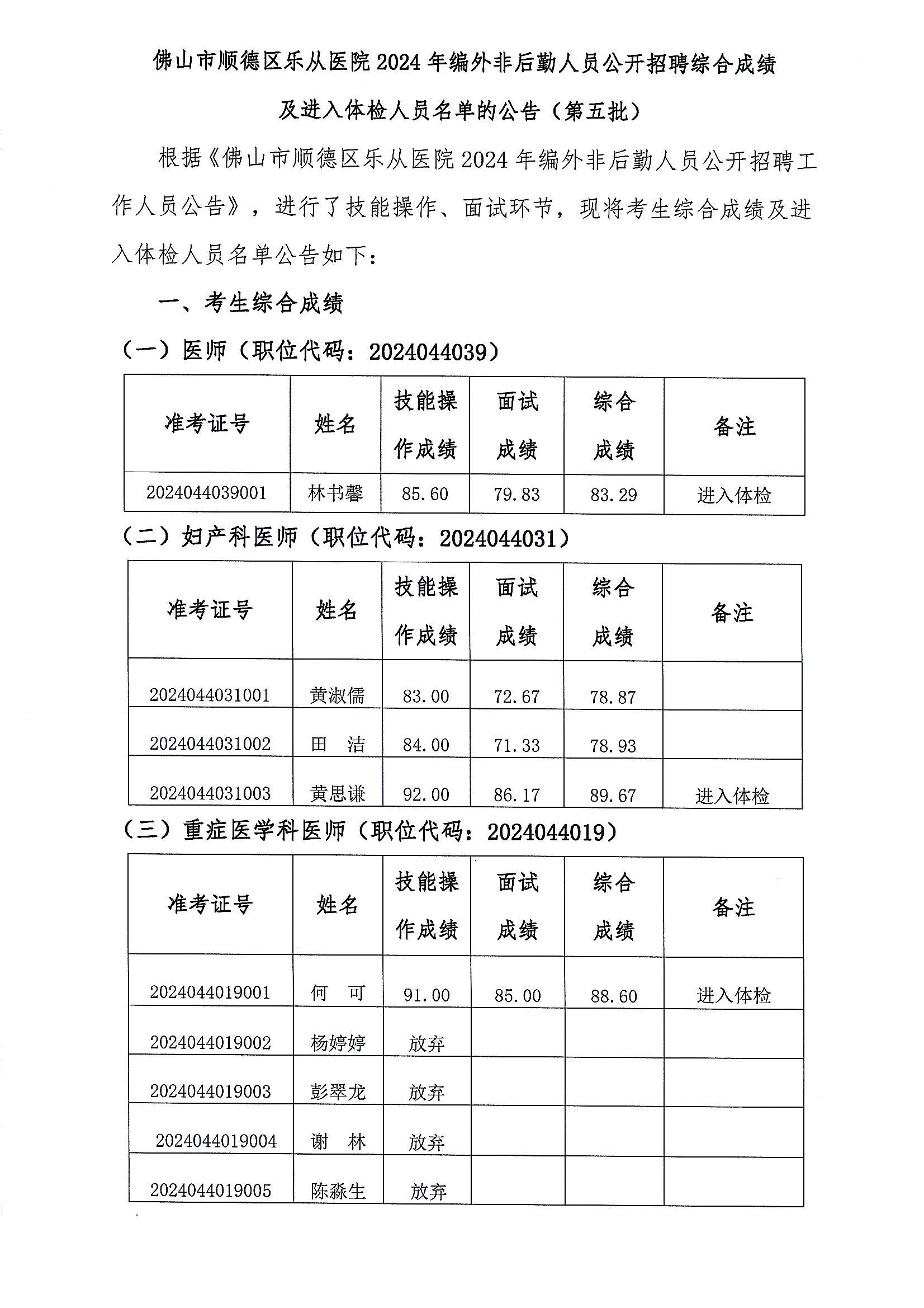 樂從醫(yī)院2024年編外非后勤人員公開招聘綜合成績及進入體檢人員名單的公告(第五批)