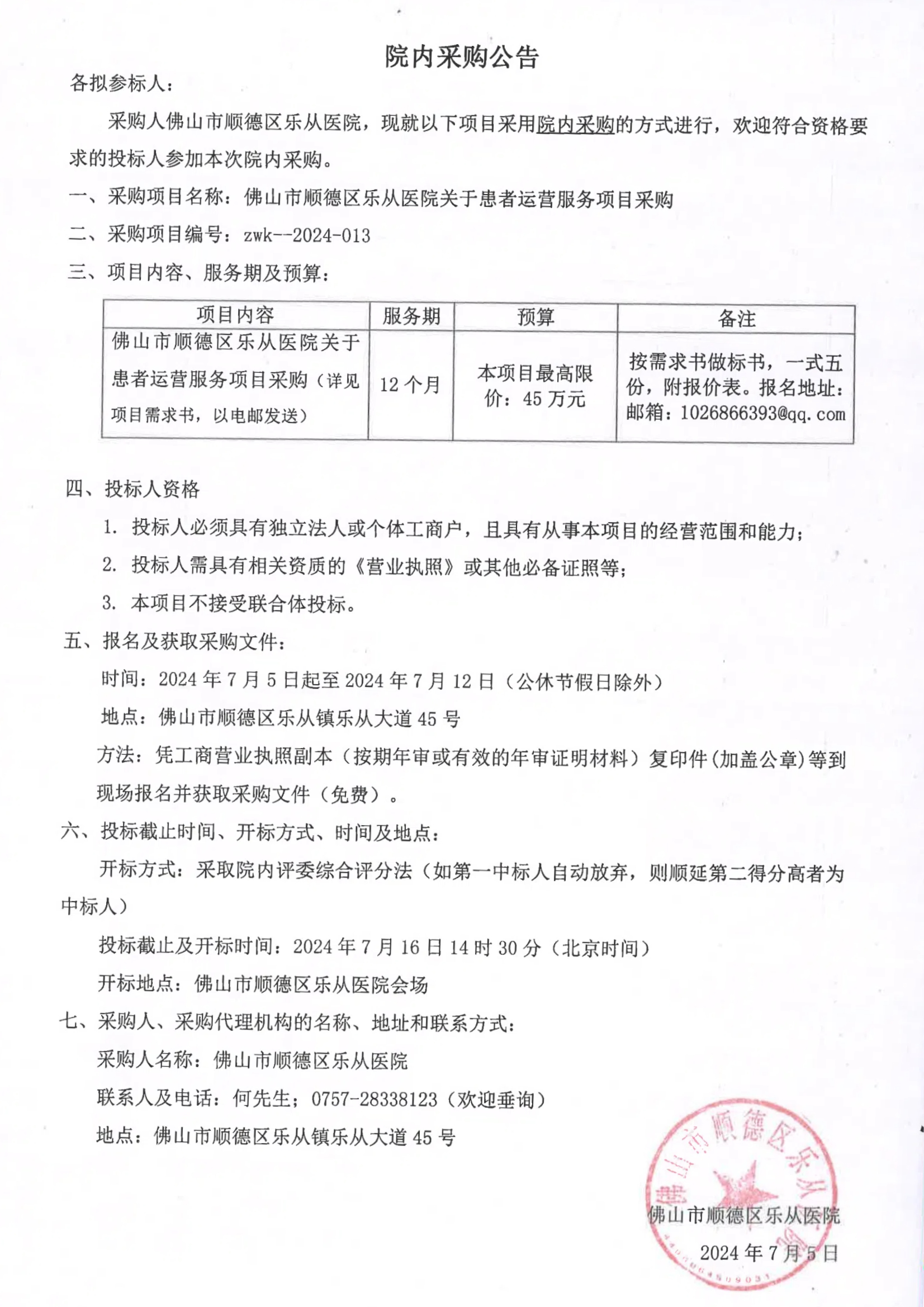樂從醫(yī)院患者運(yùn)營服務(wù)項(xiàng)目的院內(nèi)采購公告