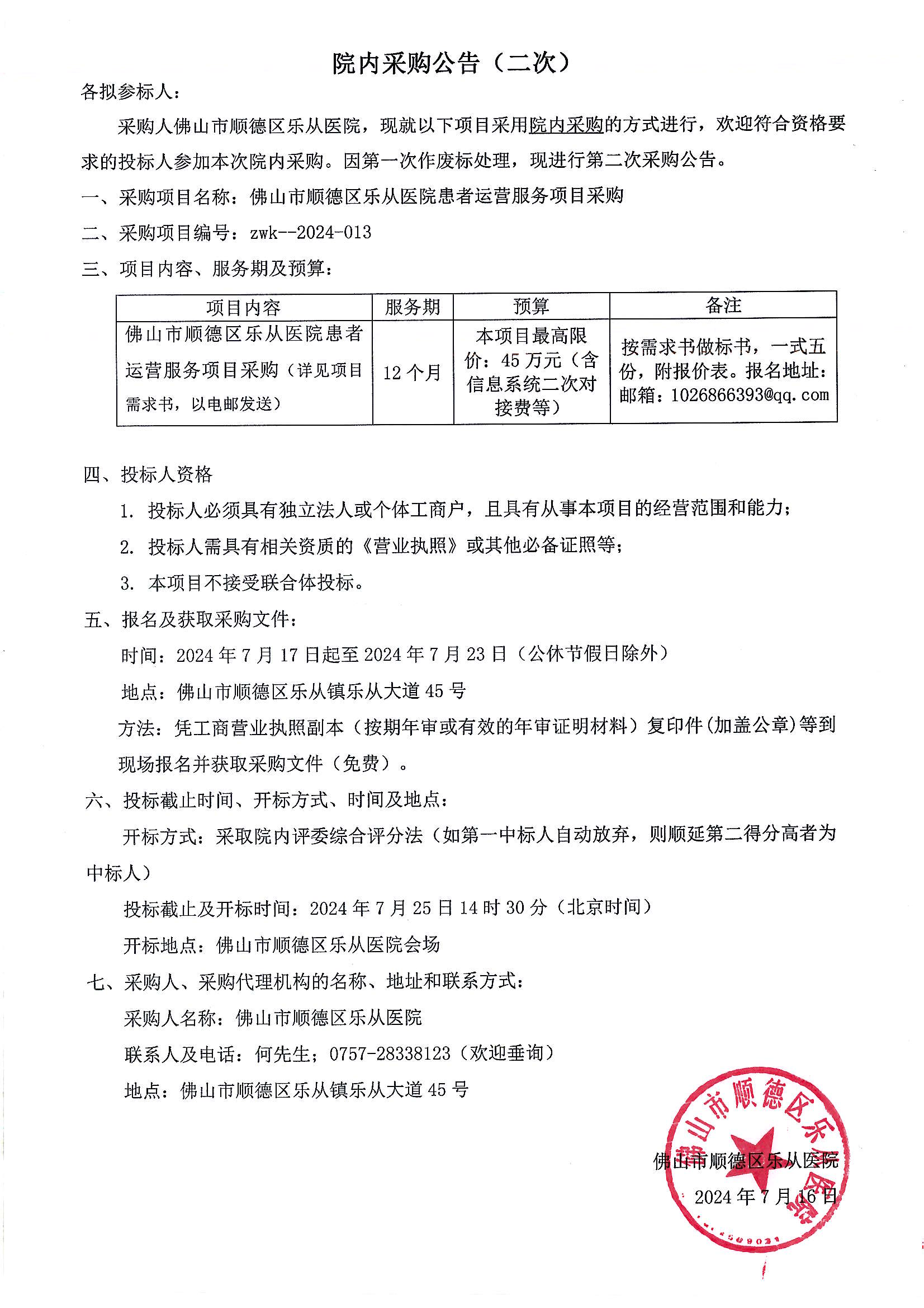 樂從醫(yī)院患者運(yùn)營(yíng)服務(wù)項(xiàng)目的院內(nèi)采購公告(第二次)