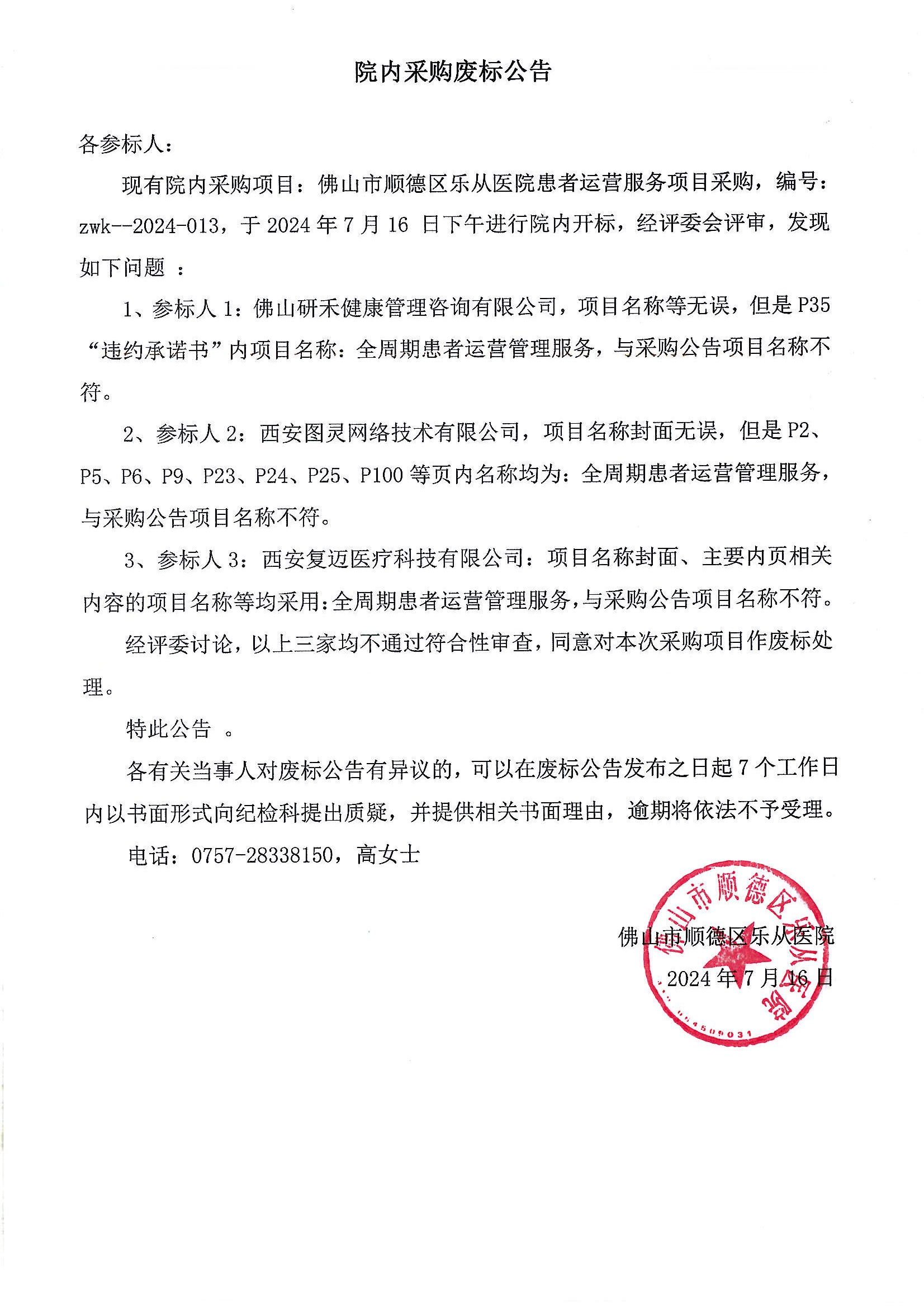 院內(nèi)采購廢標(biāo)公告