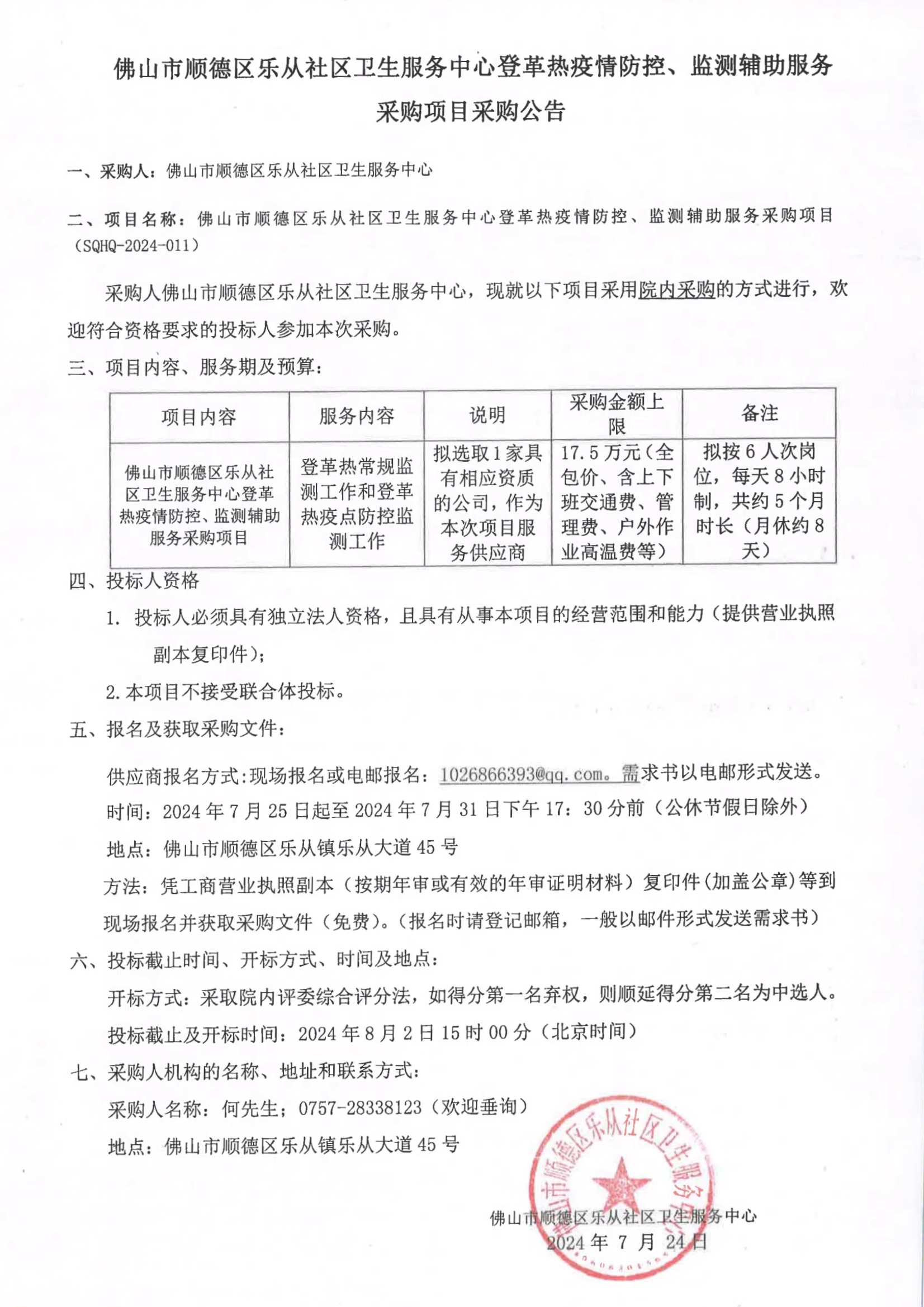 樂從社區(qū)衛(wèi)生服務(wù)中心登革熱疫情防控、監(jiān)測輔助服務(wù)采購項目的院內(nèi)采購公告