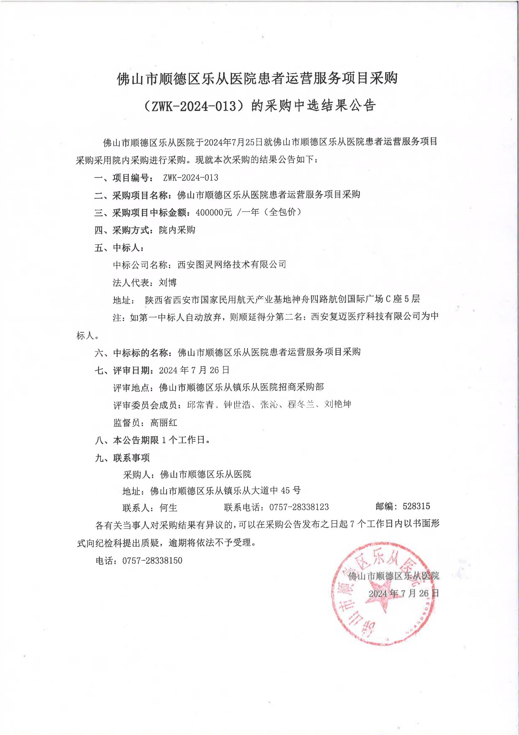 樂從醫(yī)院患者運(yùn)營服務(wù)項目(ZWK-2024-013)的采購中選結(jié)果公告