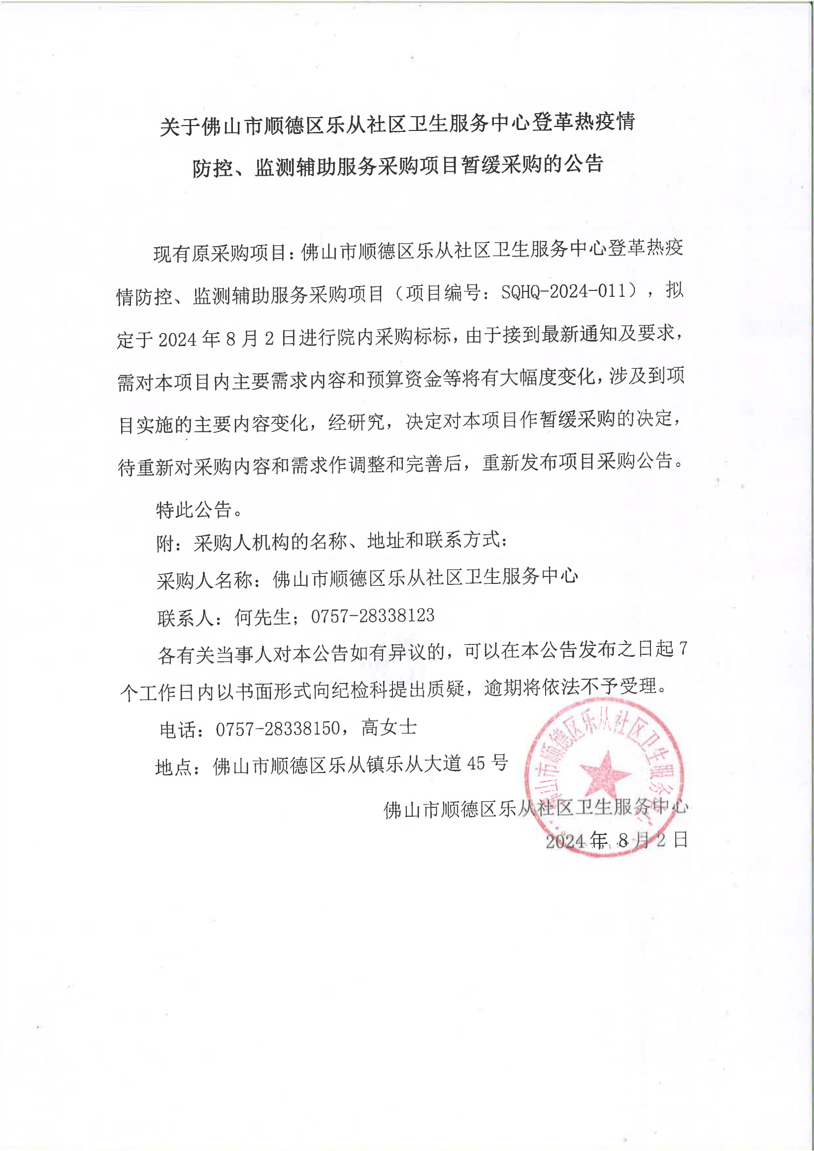 樂(lè)從社區(qū)衛(wèi)生服務(wù)中心登革熱疫情防控、監(jiān)測(cè)輔助服務(wù)采購(gòu)項(xiàng)目暫緩采購(gòu)的公告
