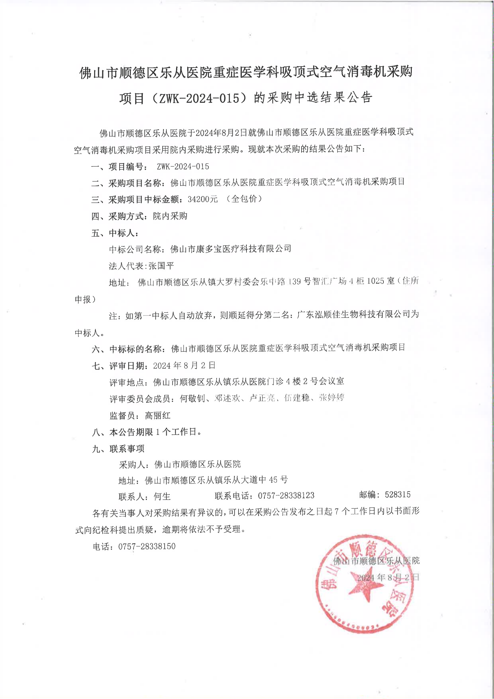 樂從醫(yī)院重癥醫(yī)學(xué)科吸頂式空氣消毒機采購項目(ZWK-2024-015)的采購中選結(jié)果公告