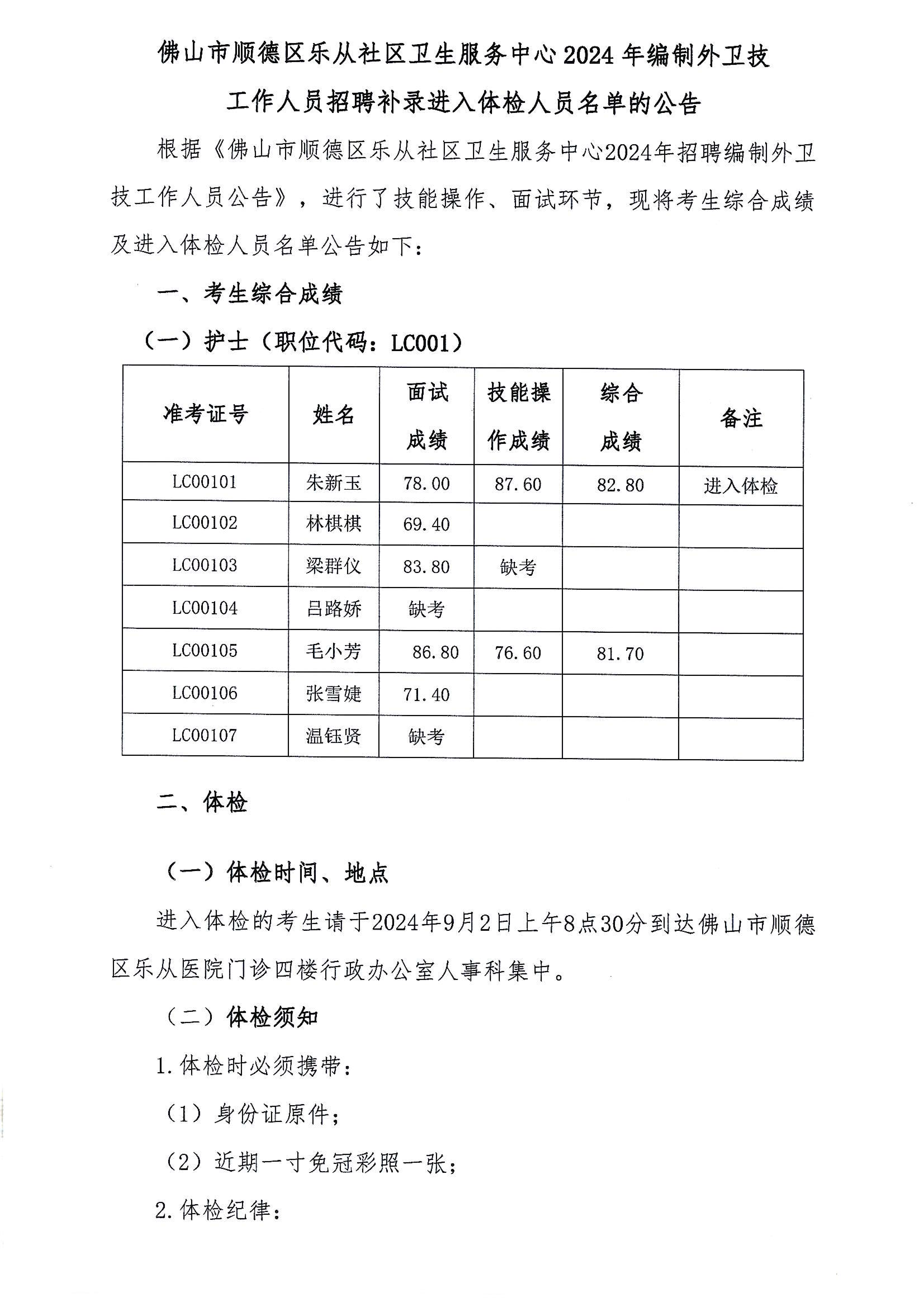 樂從社區(qū)衛(wèi)生服務(wù)中心2024年編制外衛(wèi)技工作人員招聘補錄進(jìn)入體檢人員名單的公告