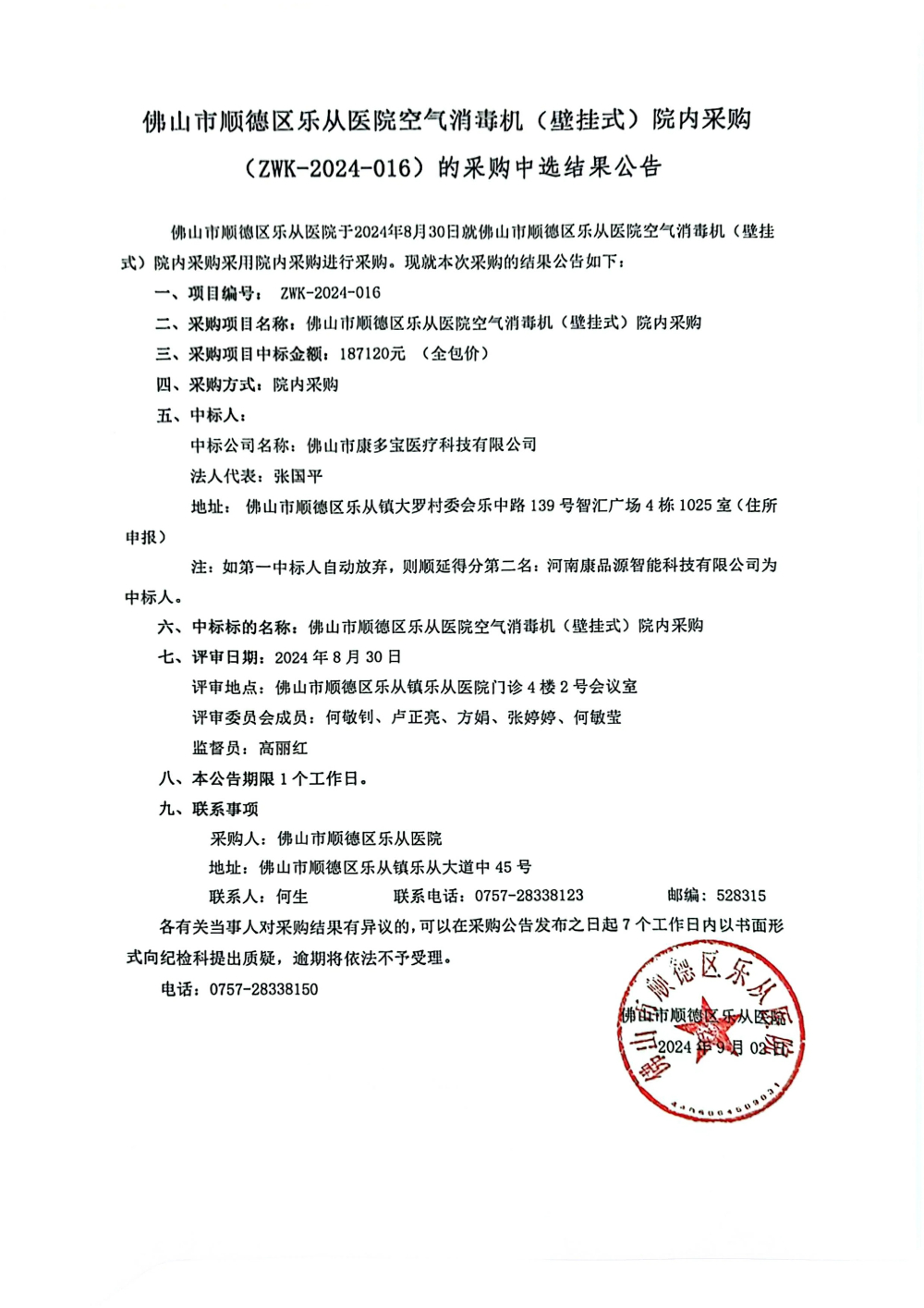 樂從醫(yī)院空氣消毒機(壁掛式)院內(nèi)采購(ZWK-2024-016)的采購中選結果公告