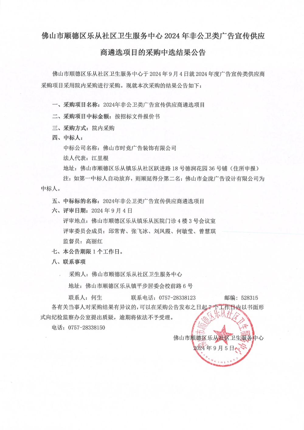 樂(lè)從社區(qū)衛(wèi)生服務(wù)中心2024年非公衛(wèi)類廣告宣傳供應(yīng)商遴選項(xiàng)目的采購(gòu)中選結(jié)果公告