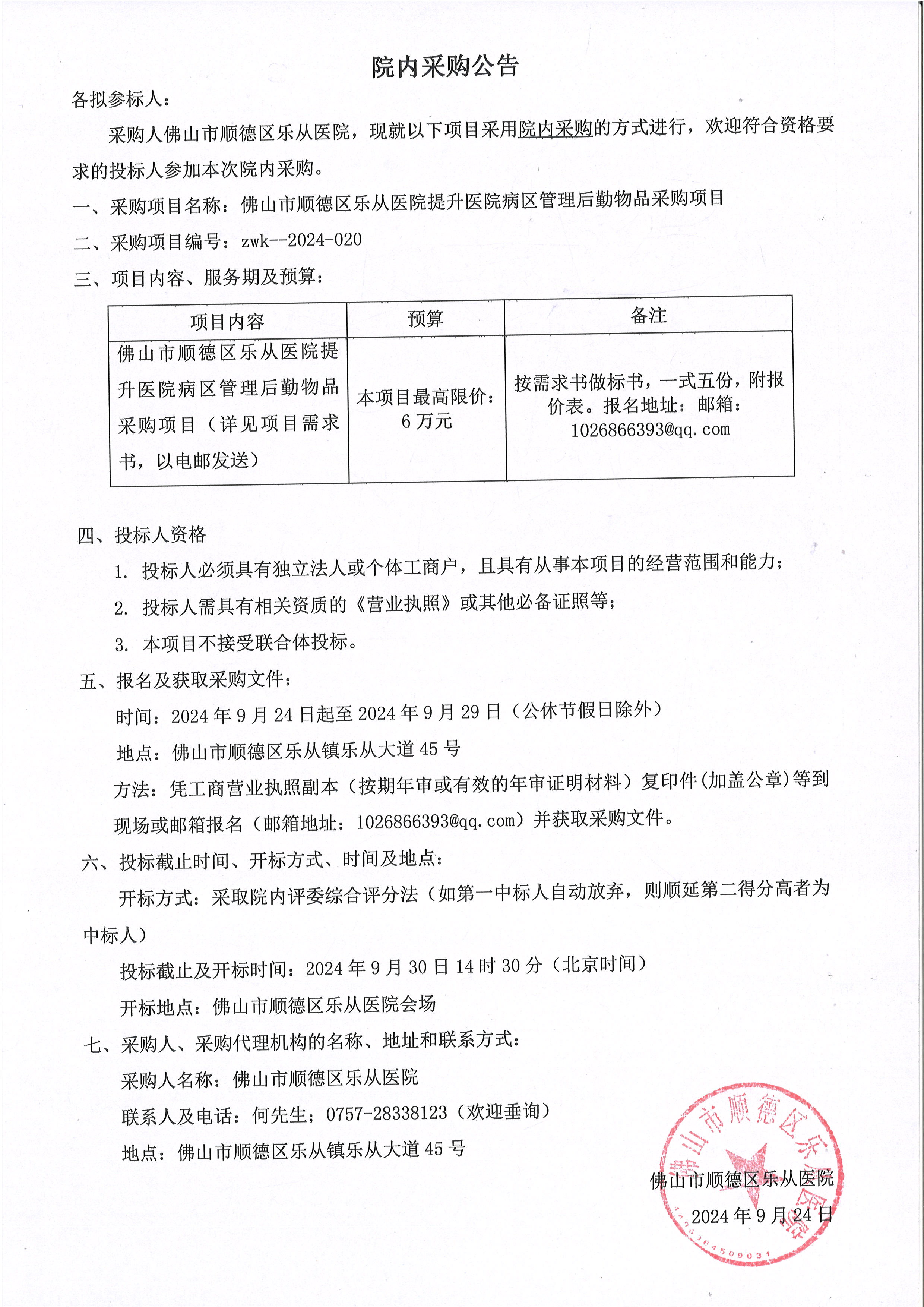 樂從醫(yī)院病區(qū)管理后勤物品采購項目的院內(nèi)采購公告