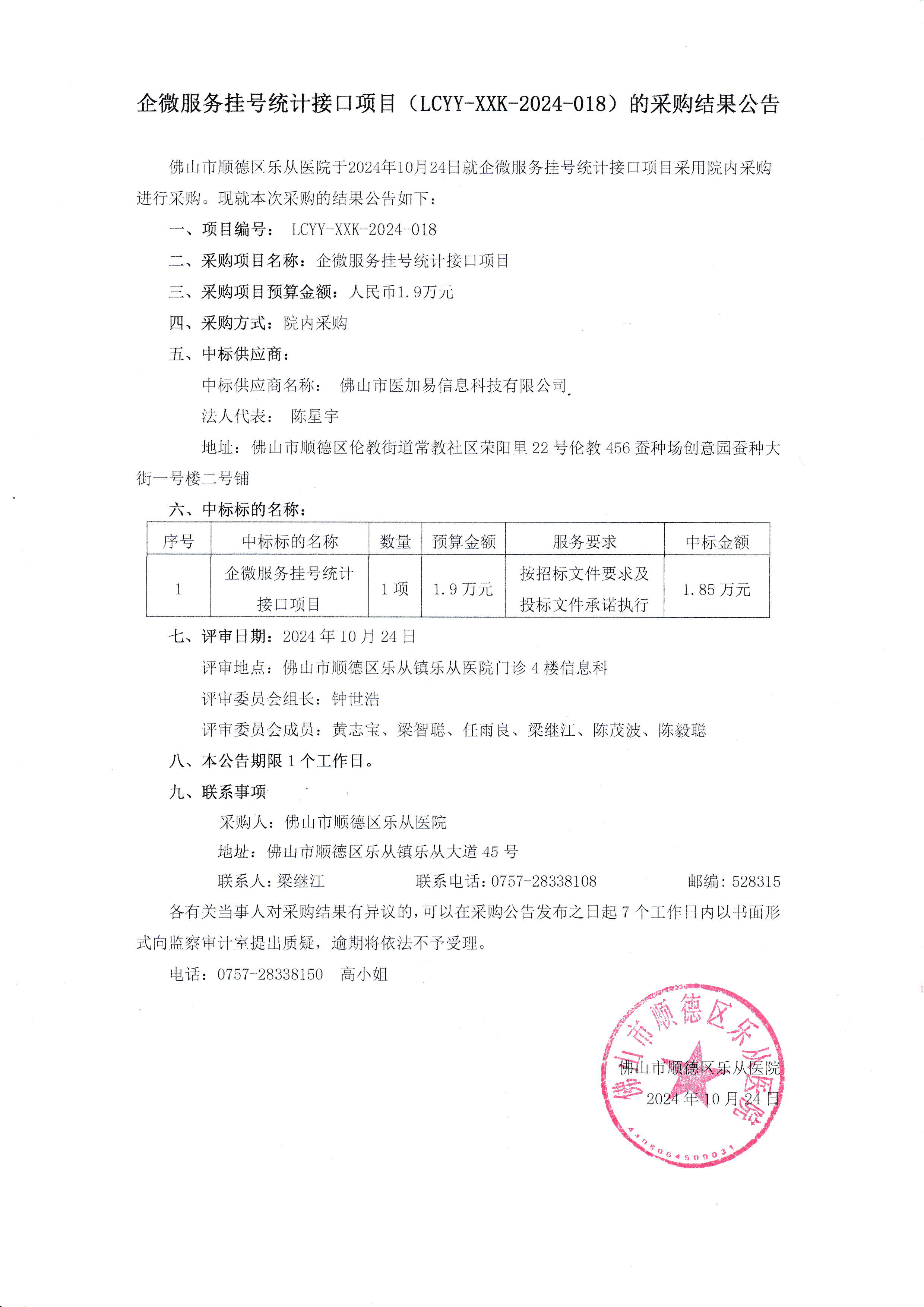 企微服務掛號統(tǒng)計接口項目-采購結果公告