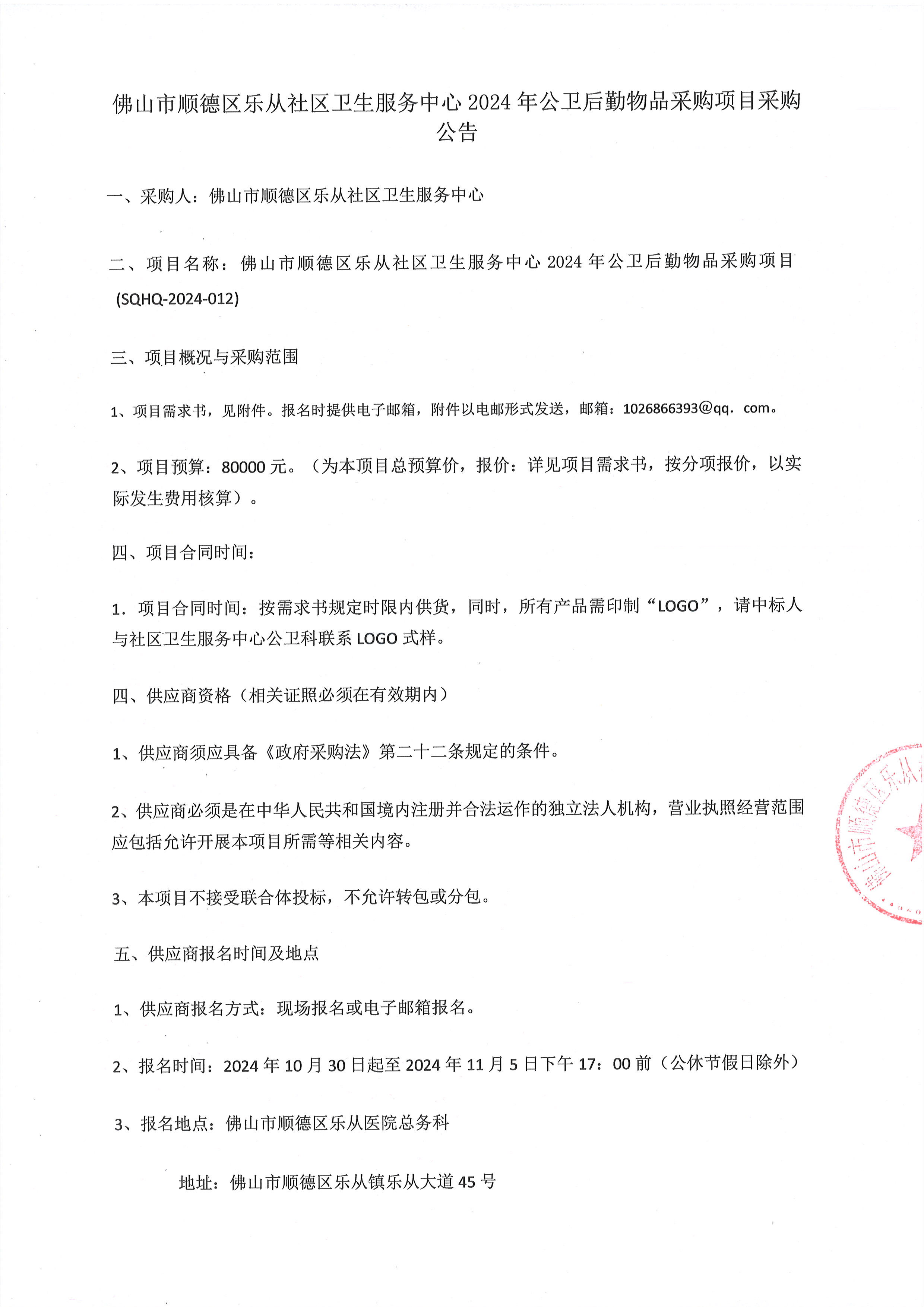 樂從社區(qū)衛(wèi)生服務(wù)中心2024年公衛(wèi)后勤物品采購的招標(biāo)公告